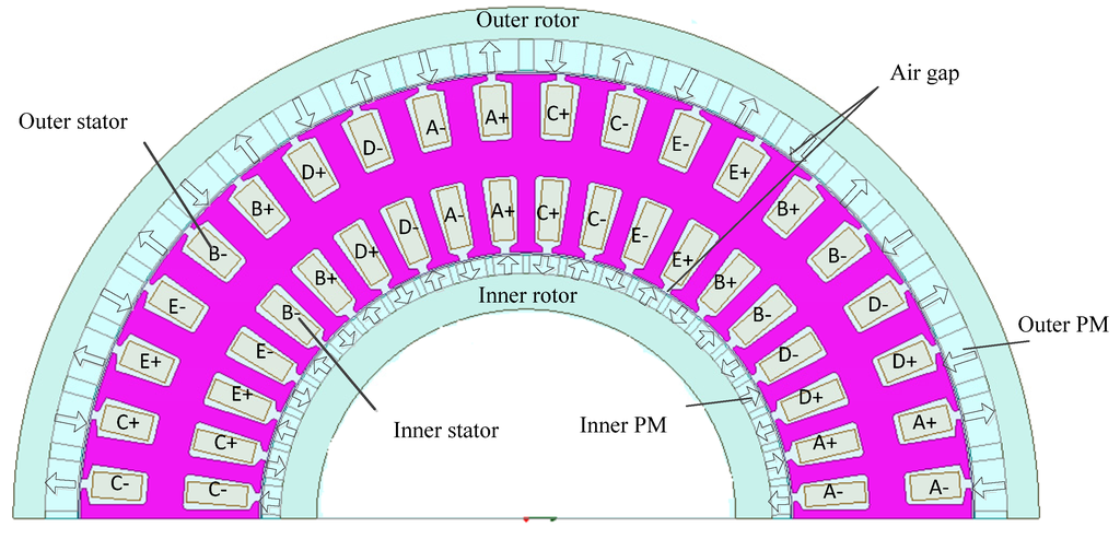 In recent decades, electric vehicles (EVs) have attracted more and more interest due to the requirements of energy conservation and emissions reduction around the world. The high power density and the capability to operate continuously under fault conditions are necessary characteristics for a motor used for EVs [1,2,3,4,5]. The permanent magnet synchronous motor (PMSM) is an attractive candidate for EVs due to its advantage of high power density. Compared to single-rotor PMSM, double-rotor PMSM (DRPMSM) has the advantages of big air gap area and large ratio of diameter to length, both of which are dominant factors in increasing the torque density [6]. By adopting multiphase techniques to stator winding, the torque density and the fault tolerance ability of the machine are further improved. Fault-tolerant operation requires connection between machine neutral point and the drive circuit neutral point for three-phase PMSM, whereas for the five-phase machines, the fault-tolerant operation can be achieved by adding fault detection and fault-tolerance control algorithms without additional hardware connections [7,8,9,10].