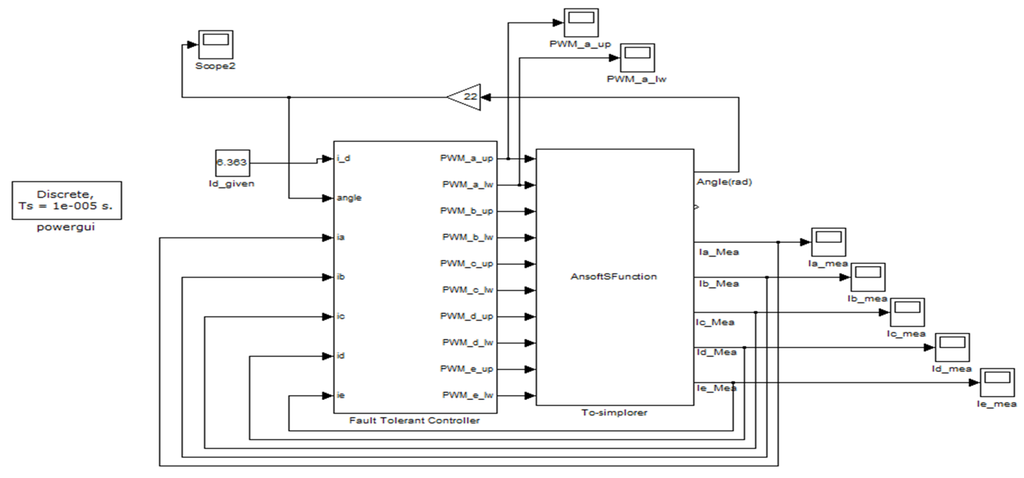 The fault tolerant algorithm was accomplished in Simulink on the basis of the fault tolerant techniques investigated above. In order to ensure the injected currents are more flexible, the current hysteresis control technique is adopted. Operated under normal conditions, the control scheme is shown in Figure 2. When an open circuit fault occurs in the machine or the driver, whereby the fault type should be detected first, the corresponding injected currents are produced by fault-tolerant control algorithms. Figure 29 shows the fault tolerant control block diagram which adopts hysteresis control in the current loop in serial drive mode. Open circuit fault type can be detected through the current detection followed by the control scheme switch to fault tolerant control algorithm.