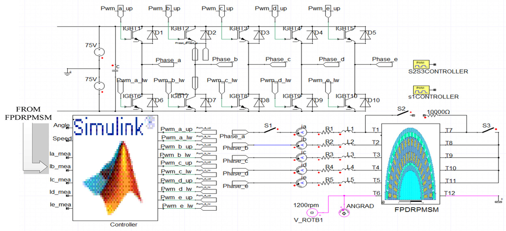 In this section, the co-simulation results based on Simulink-Simplorer-Maxwell are illustrated to verify the effectiveness of the aforementioned techniques. Maxwell is community software for design of electrical motors but it lacks facilities for the design of drivers. On the other hand, the model of power electronic components is more accurate in Simplorer software compared to Simulink, which can provide a suitable environment for designing controllers [33,34]. In this paper, the DRPMSM is designed in Maxwell, and the driver circuit is designed in Simplorer in which the details of IGBTS are listed. Meanwhile, the fault tolerant controller is designed in Simulink. By linking these, an appropriate tool is provided for a realistic fault-tolerant driver with a five-phase DRPMSM. Figure 28 shows the finite element model of the motor designed in Maxwell and Table 14 shows some of the parameters of the five-phase DRPMSM.