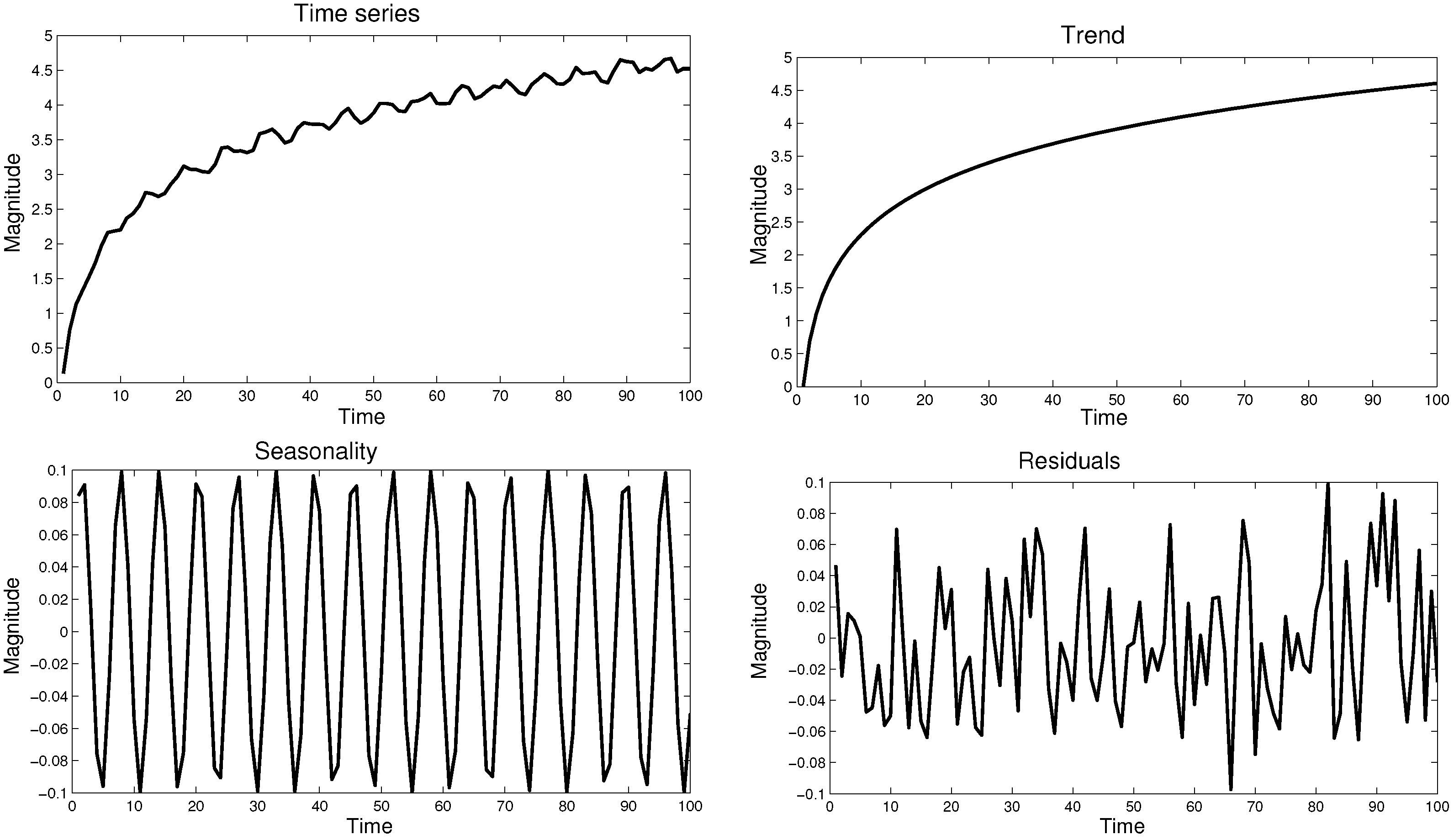 - Residuals. Once the trend and cyclic oscillations have been calculated and removed, some residual values remain. These values can be, sometimes, high enough to mask the trend and the seasonality. In this case, the term outlier is used to refer these residuals, and robust statistics are usually applied to cope with them [18]. These fluctuations can be of diverse origin, which makes the prediction almost impossible. However, if by any chance, this origin can be detected or modeled, they can be thought of precursors in trend changes.