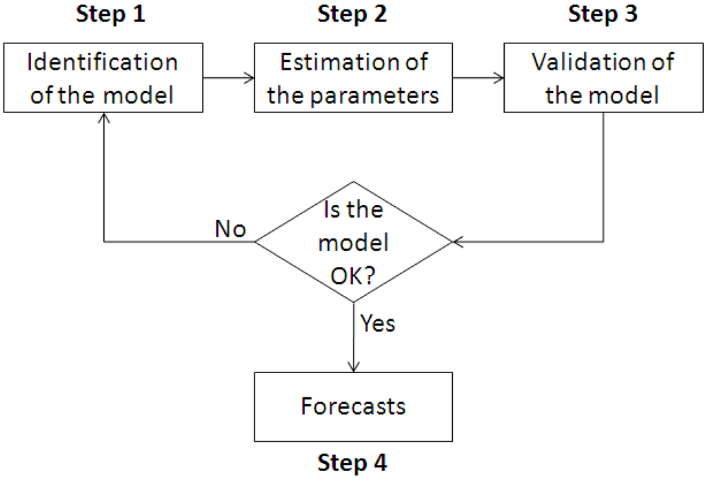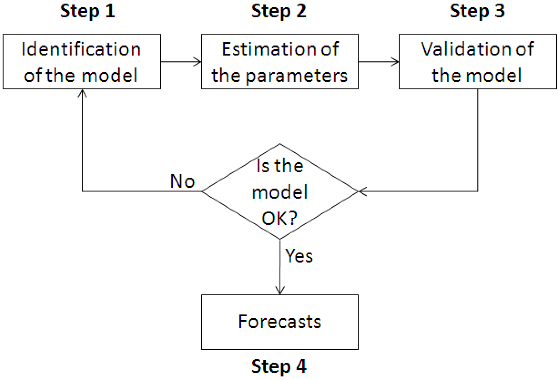 Autoregressive integrated moving average processes (ARIMA) are the most general methods and are the result of combining AR and MA processes. ARIMA models are denoted as , where p is the number of autoregressive terms, d the number of nonseasonal differences, and q the number of lagged forecast errors in the prediction equation. These models follows a common methodology, whose application to time series analysis was first introduced by Box and Jenkins [21]. Thus, this methodology proposes an iterative process formed by four main steps as illustrated in Figure 3.