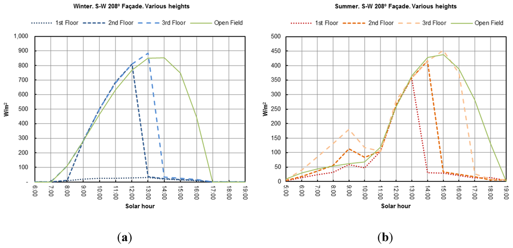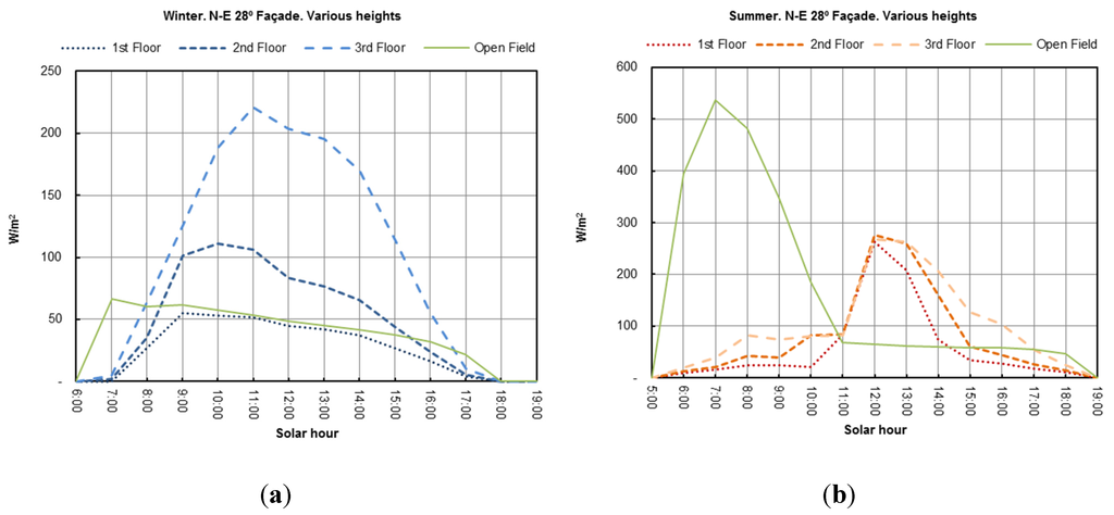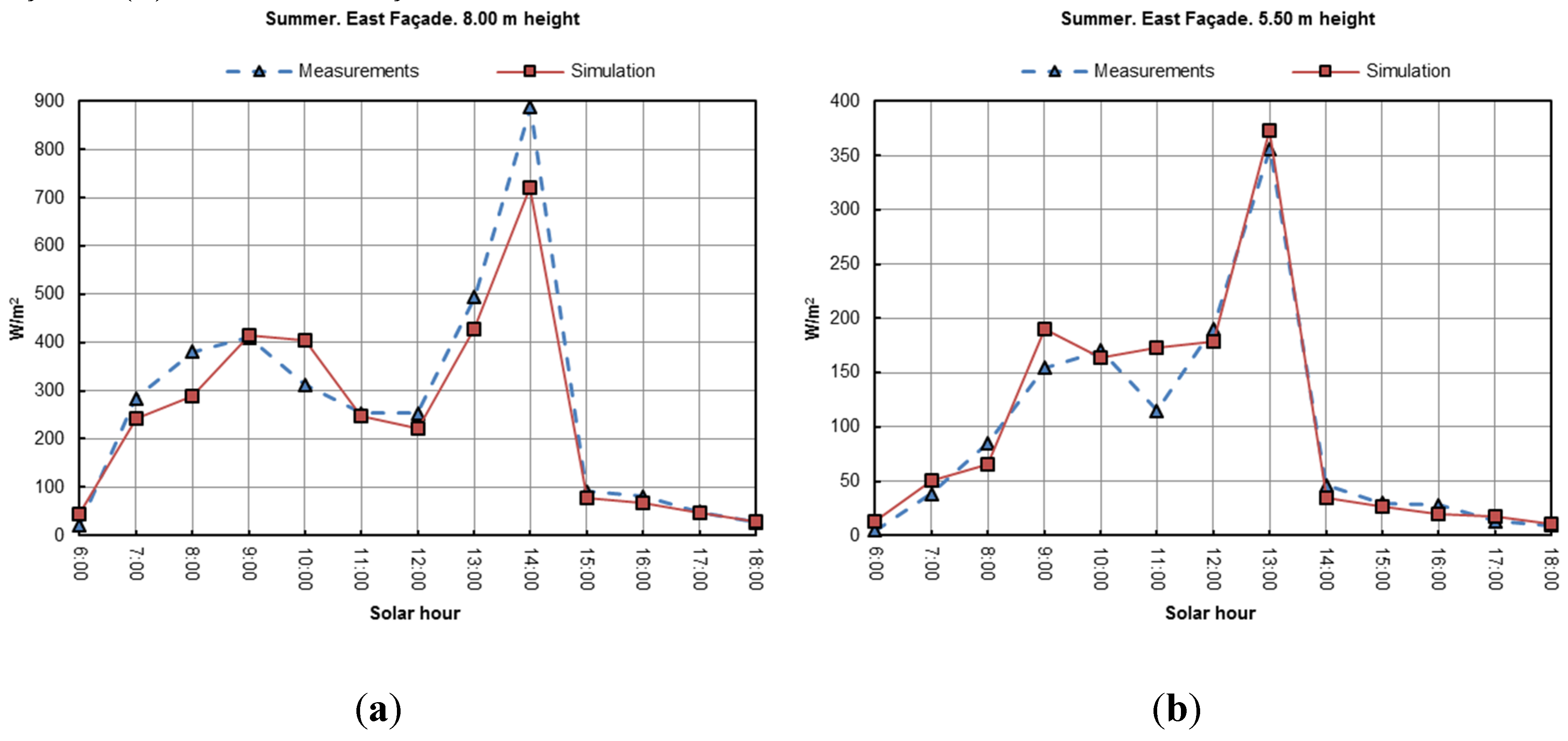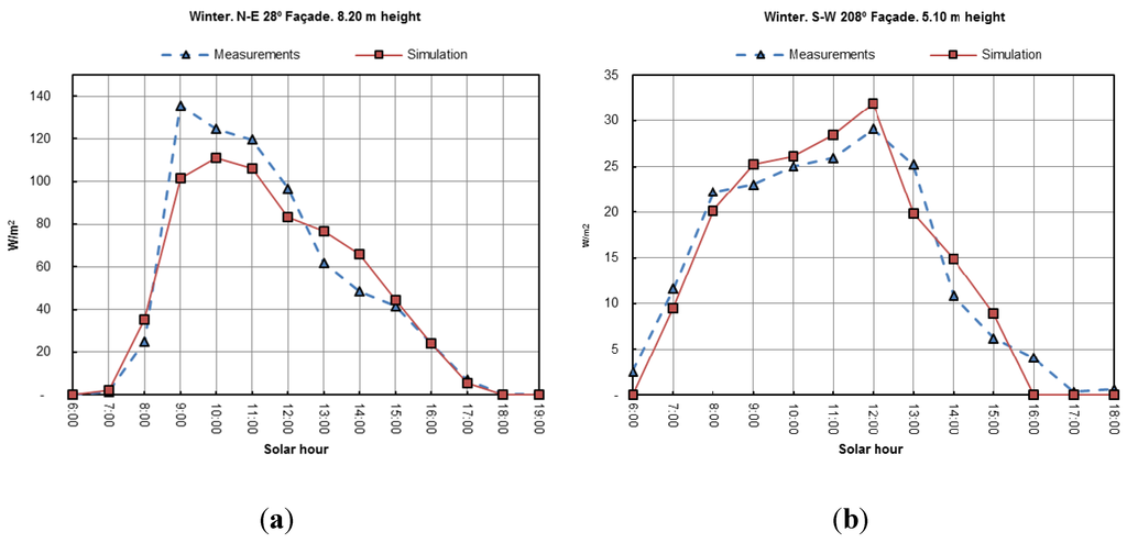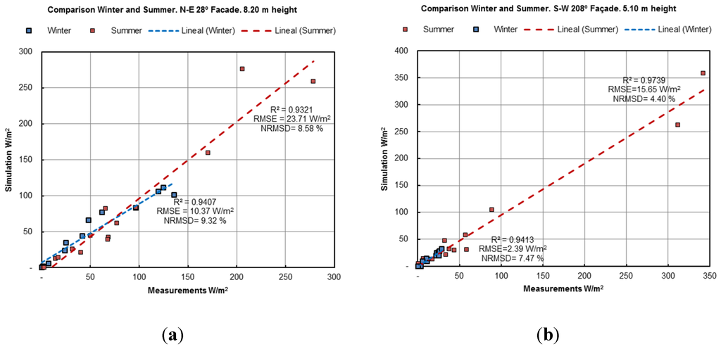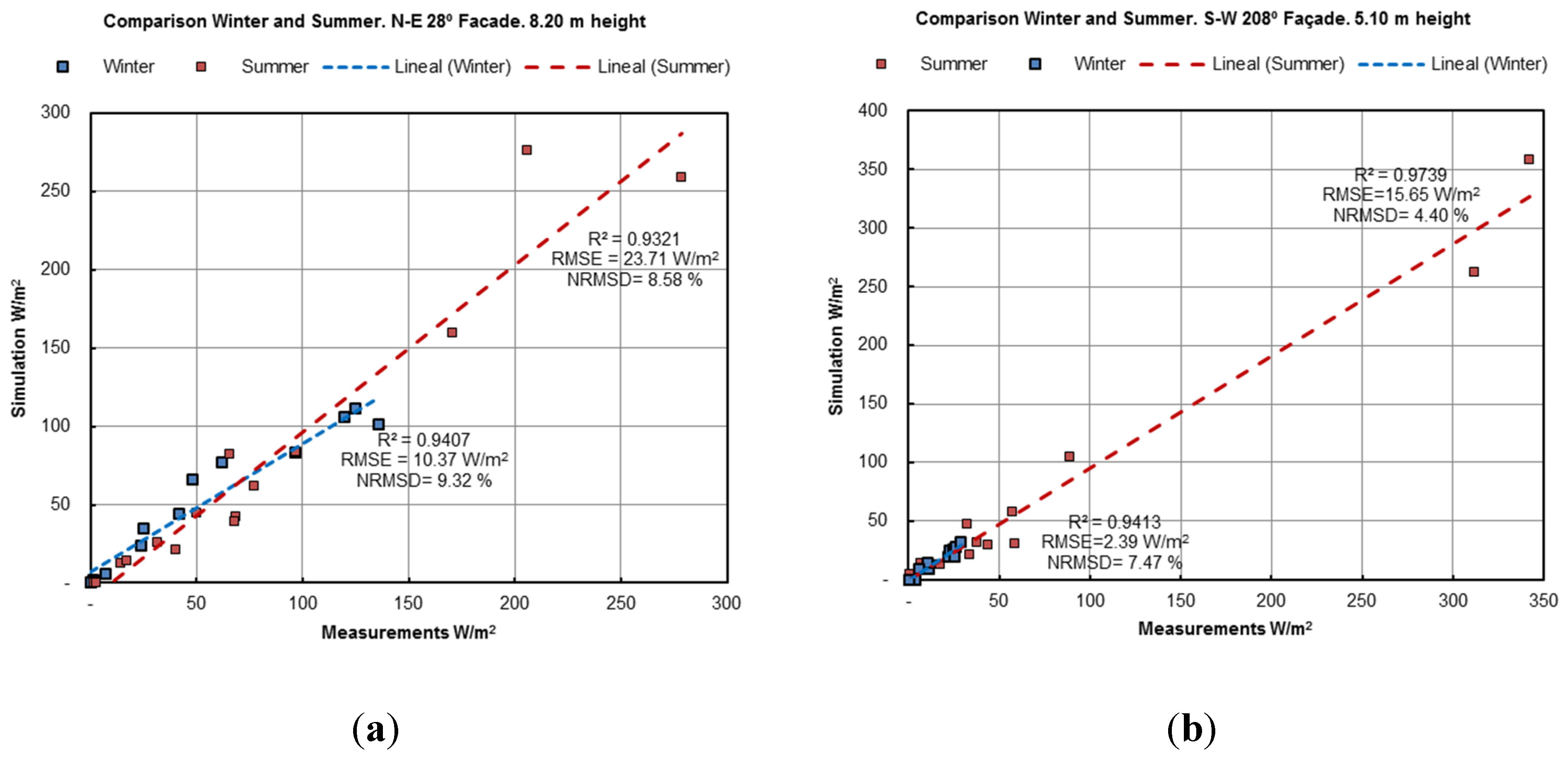 - The DLSC of Cadiz is composed of 28º North-East and 208º South-West façades; H = 15.50 m, W = 4.00 m (Figure 6a). On-site measurement data were compared in both winter (Figure 7a,b) and summer (Figure 8a,b) at different heights. Cells were placed in the 28º North-East façade, with an altitude over the street level of 8.20 m and in the 208º South-West façade at 5.10 m. Cell measurements and simulations are also compared by means of Correlation R2, RMSE and NRMSD (Figure 9a,b).
