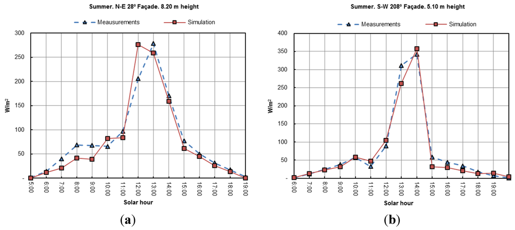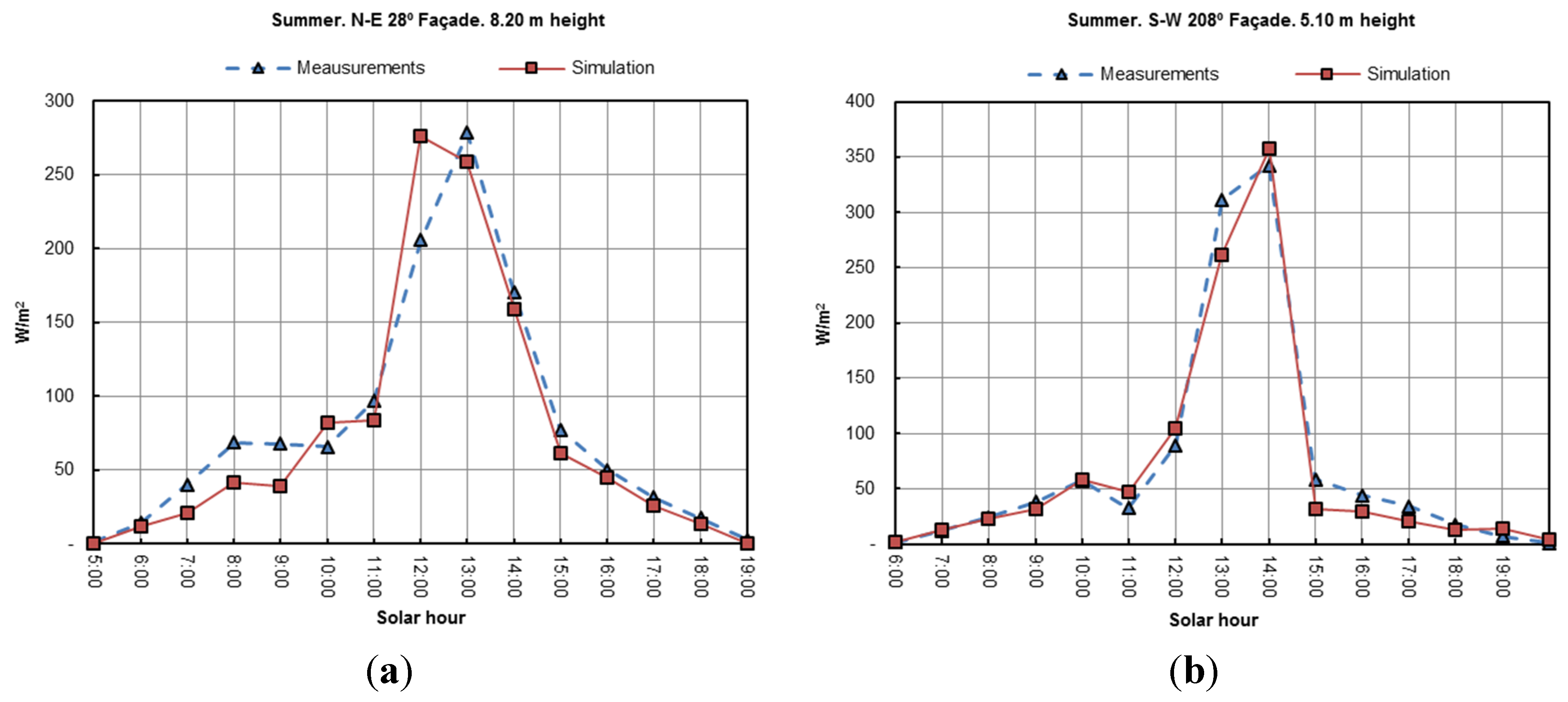 - Acceptable accuracy of the model after comparing with real measurements. Other point that has proven to be a cornerstone in this research is the comparison of results with on-site real measurements. Even when a simulation model gives physically reasonable results, it is always advisable to compare with real conditions. In this case, cross-checking against two real case-studies, two street canyons located in two Southern European cities, have proven that the model reproduces the behavior of radiation interchanges with acceptable accuracy, even when for some specific times and situations results may differ. These errors can be explained and their degree of uncertainty, in the whole, is acceptable, with average values about 6% of the total.