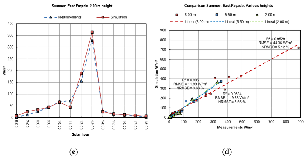 - The DLSC of Seville is composed of East façade H = 8.00 m, (Figure 6b) were measurements cells were placed, West façade H = 11.00 m and W = 2.00 m. The second example for validation is an East façade during summer in an urban canyon of Seville. In this case, the comparison have done at different heights in the same façade; 8.00 m (Figure 10a); 5.50 m (Figure 10b), 2.00 m (Figure 10c) and by means of Correlation R2, RMSE and NRMSD (Figure 10d).