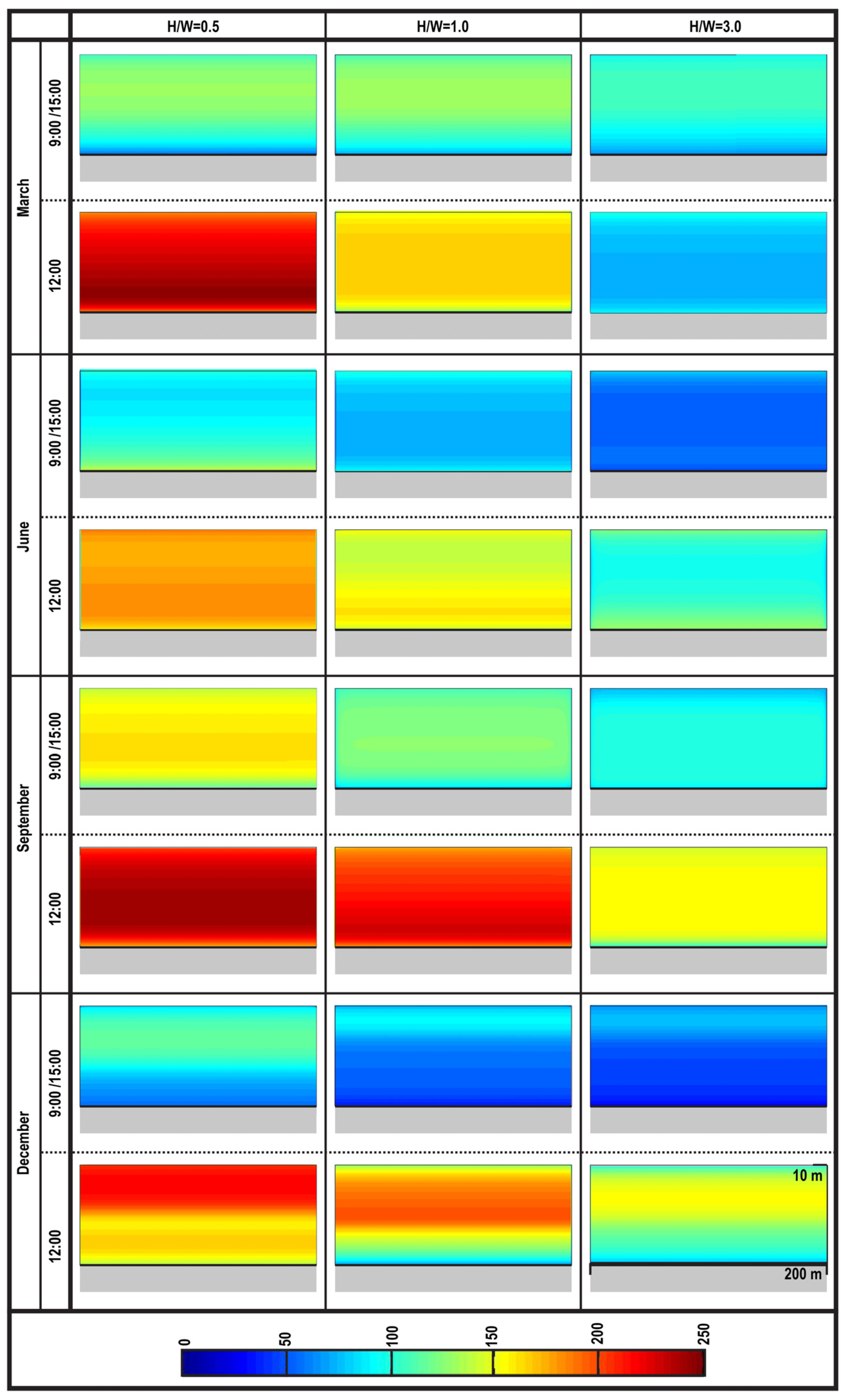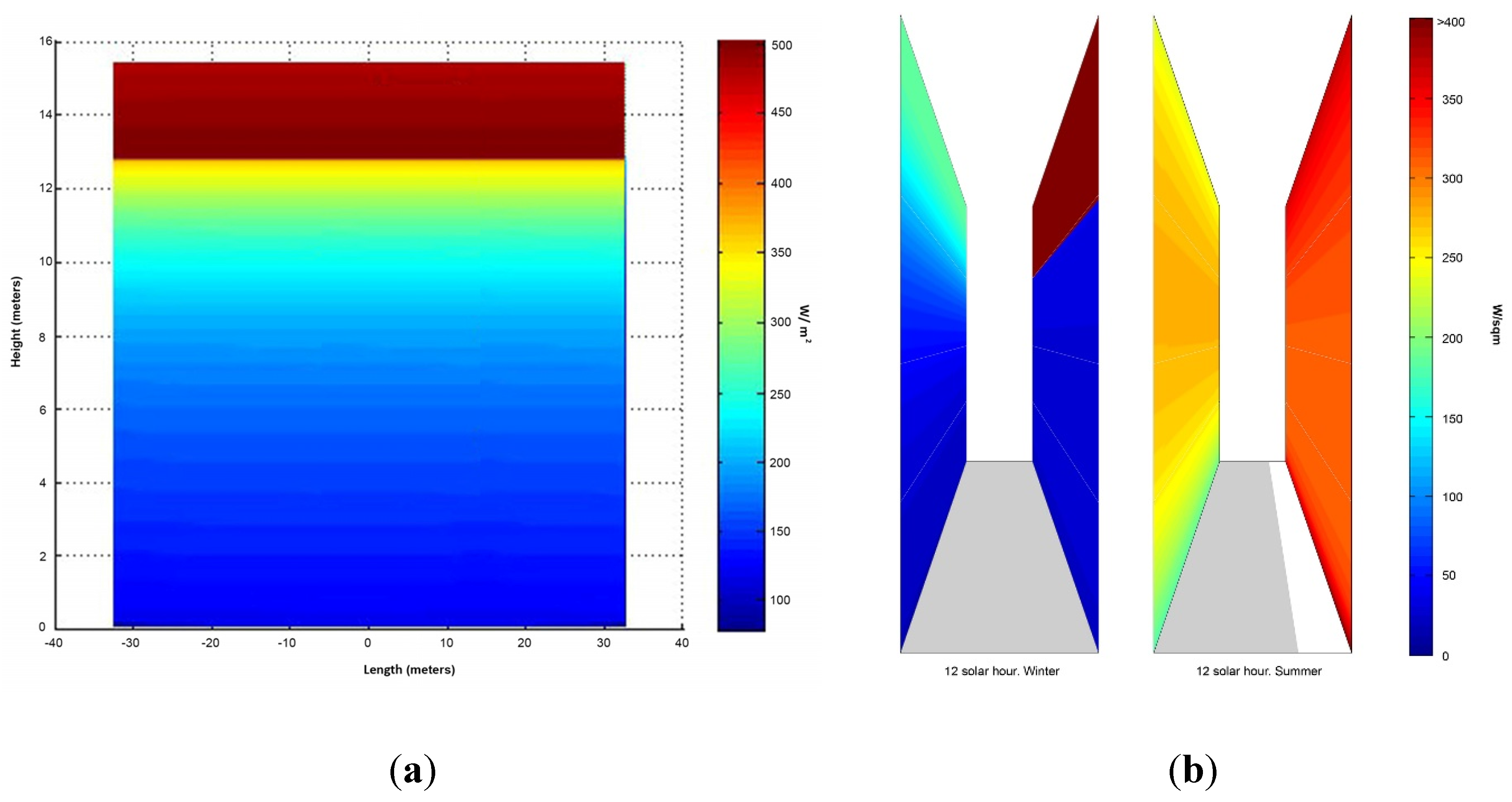 - Possibility of simulating several types of street canyons without having to prepare several 3D models. Useful for parametric analysis and research purposes. Other main outcome that can be considered useful in terms of computing and time cost is the possibility of calculating radiant distribution in a façade without the necessity of making a 3D model in a computer CAD program, and therefore importing into the model. In this case, the model constructs the scenario only with numerical data, which is faster to input. In addition, input data can be stored in matrixes and then one or more variables can be set free to perform a bench test or a parametric analysis, such in this case in point 5.3. This can be useful to research purposes which usually requires handling bigger amounts of data.