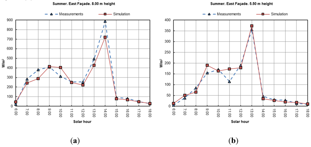 In the numerical values, the biggest errors that can be found in each cross-check are as follows. For Figure 7a, simulation gives 101.4 W/m2 at 9:00 against a measured value of 135.7 W/m2, which is a relative error of 25%; for Figure 7b, simulation gives an output of 31.9 W/m2 at 12:00 against 29.1 W/m2 for measured values, which means an error of 9%. For Figure 8a, simulation gives a simulated value of 276.3 W/m2 against 206 W/m2 at 12:00, which means an error of 25%; for Figure 8b, simulation gives an output of 311.62 W/m2 at 12:00 against a measured value of 261.9 W/m2, which is a relative error of 16%. For Figure 10a, simulation gives at 10:00 a value of 380.3 W/m2 against a value of 290.0 W/m2, which means an error of 24%; for Figure 10b, at 11:00 simulation gives an output of 172.6 W/m2 against a value of 115.0 W/ m2 for measured data, which means an error of 33%; for Figure 10c, simulated data at 11:00 is 44.5 W/m2 against 72.3 W/m2, which means an error of 39%.
