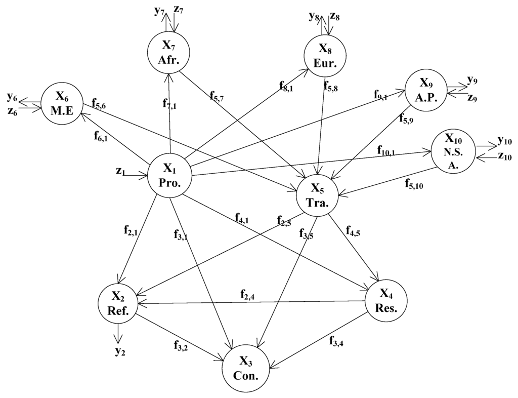 Network model of China’s natural gas supply system on the regional layer (RL). X1 (Pro.): natural gas production sector, X2 (Ref.): natural gas refining sector, X3 (Con.): natural gas consumption sector, X4 (Res.): natural gas reserve sector, X5 (Tra.): natural gas transit sector, X6 (M.E.): Middle East, X7 (Afr.): Africa, X8 (Eur.): Europe, X9 (A.P.): Asian-Pacific region, X10 (N.S.A.): North and South America, fij: flow from node j to node i, zi: flow into node i from outside the network, yj: flow out of the network from node j.