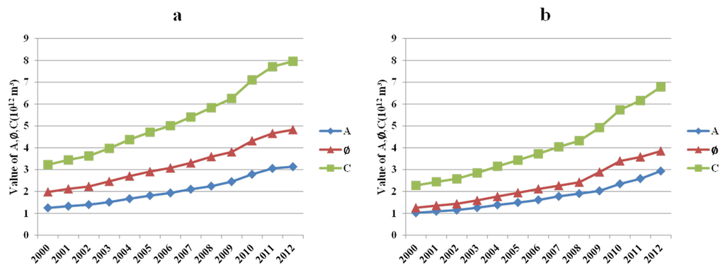 As indicated in Figure 3, the overall security (Curve C) of China’s natural gas supply system evidenced stable improvement from 2000 to 2012, while efficiency (Curve A) and resilience (Curve Φ) both increased during the same period. The growth in natural gas imports and the decrease in exports (see Figure 4) contributed to the increase in the security level of the natural gas supply system. Specifically, the first evident growth phase relating to security was observed from 2003 to 2004. This may have been associated with the remarkable reduction in the volume of gas exports that occurred in 2003 and 2004. Another phase of greater growth occurred from 2009 to 2010, coinciding with the import of liquefied natural gas into China which began in 2010. Subsequently, the amount of liquefied natural gas imports increased gradually. This growth trend is consistent with the continuous increase of the sustainability of China’s natural gas industry from 2008 to 2013 [78], which is found mainly contributed by growing supply and demand of natural gas, beneficial policy, technological innovation, and the reformation of the gas market in China.