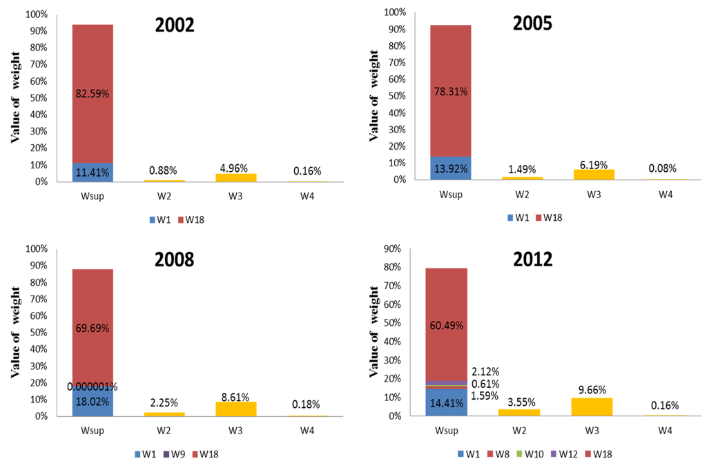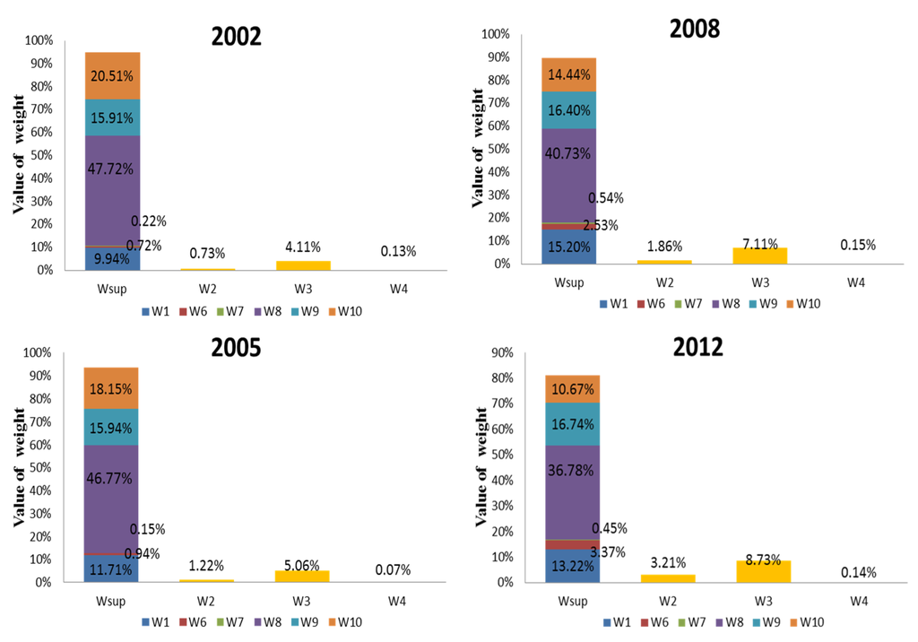 The weights of different nodes of China’s natural gas supply system from 2000 to 2012 based on a network model constructed on the RL. The first column, named Wsup, indicates the weights of supply sources, including internal sources. Within the Wsup column, the blue column at the bottom, denoted as W1, indicates the production sector. External sources are shown in other colors in the first column. They are denoted as W6, W7, W8, W9, and W10, representing the weights of the Middle East, Africa, Europe, Asia-Pacific, and North and South America, respectively. The second, third, and fourth columns represent the weights of the sectors of refining, consumption, and reserve, respectively, denoted as W2, W3, and W4.