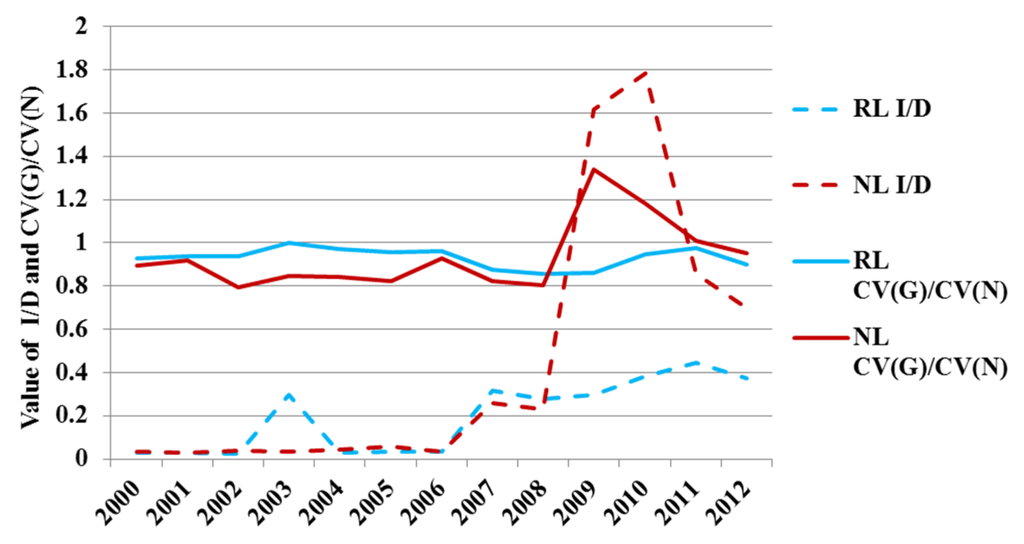 Figure 9 shows changes in the MI from 2000 to 2012 which differed for the two models. Thus, the MI generally increased for the RL model during the study period, whereas it generally decreased for the NL model. Moreover, it was lower than one prior to 2009 and higher than one after that time for the RL model. Conversely, the MI was higher than one prior to 2009 and lower than one after that time for the NL model.