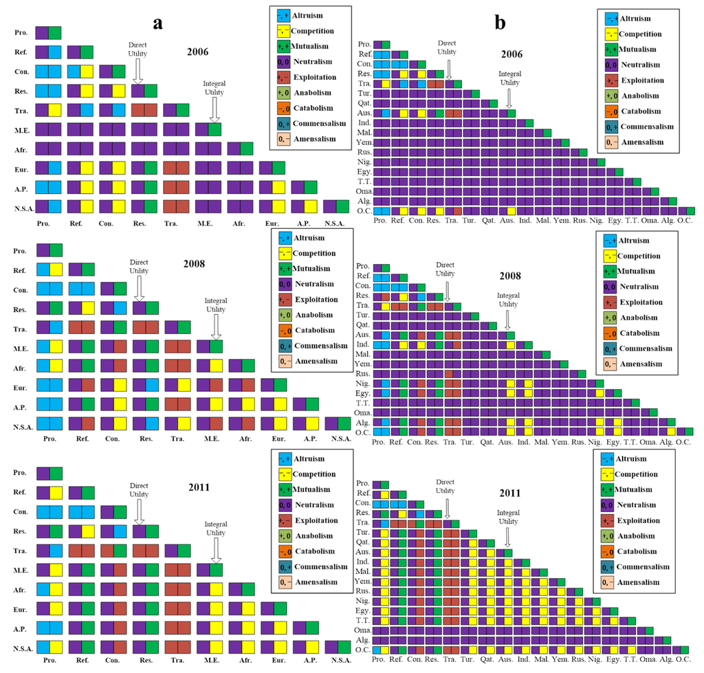 Direct and integral utility of China’s natural gas supply system in 2006, 2008, and 2011 based on network models on: (a) the RL and (b) the NL. Mutual relationships between two sectors are shown in different colors, whose direct and integral utilities were also isolated in two boxes. Pro.: natural gas production sector, Ref.: natural gas refining sector, Con.: natural gas consumption sector, Res.: natural gas reserve sector, Tra.: natural gas transit sector, M.E.: Middle East, Afr.: Africa, Eur.: Europe, A.P.: Asian-Pacific region, N.S.A.: North and South America, Tur.: Turkmenistan, Qat.: Qatar, Aus.: Australia, Ind.: Indonesia, Mal.: Malaysia, Yem.: Yemen, Rus.: the Russian Federation, Nig.: Nigeria, Egy.: Egypt, T.T.: Trinidad and Tobago, Oma.: Oman, Alg.: Algeria, O.C.: other countries.