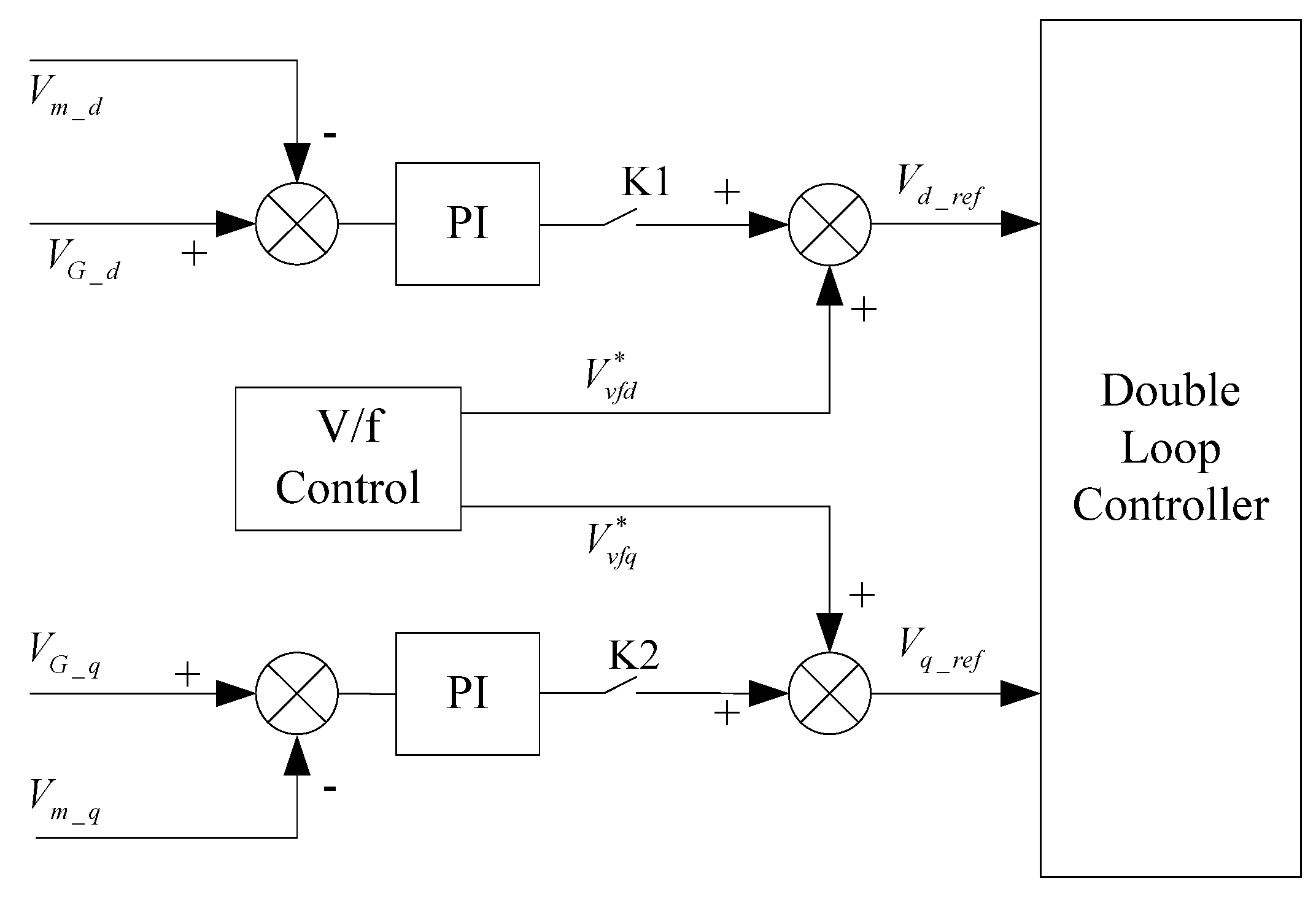 - Vandoorn, T.L.; Meersman, B.; de Kooning, J.D.; Vandevelde, L. Transition from islanded to grid-connected mode of microgrids with voltage-based droop control. IEEE Trans. Power Syst. 2013, 28, 2545–2553. [Google Scholar] [CrossRef]
