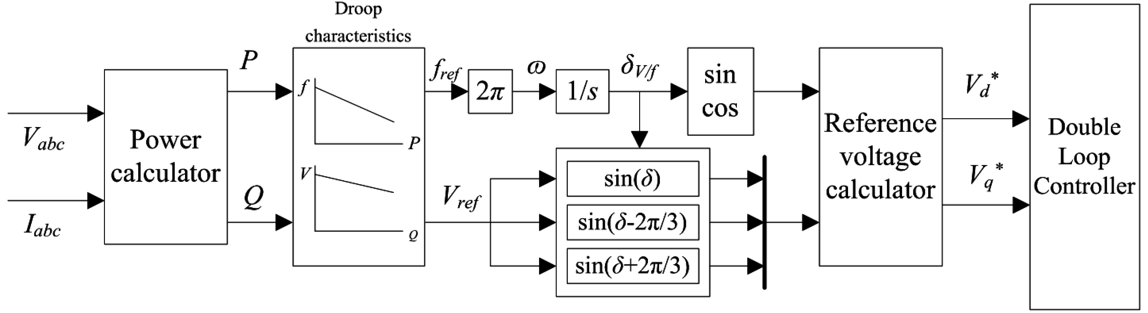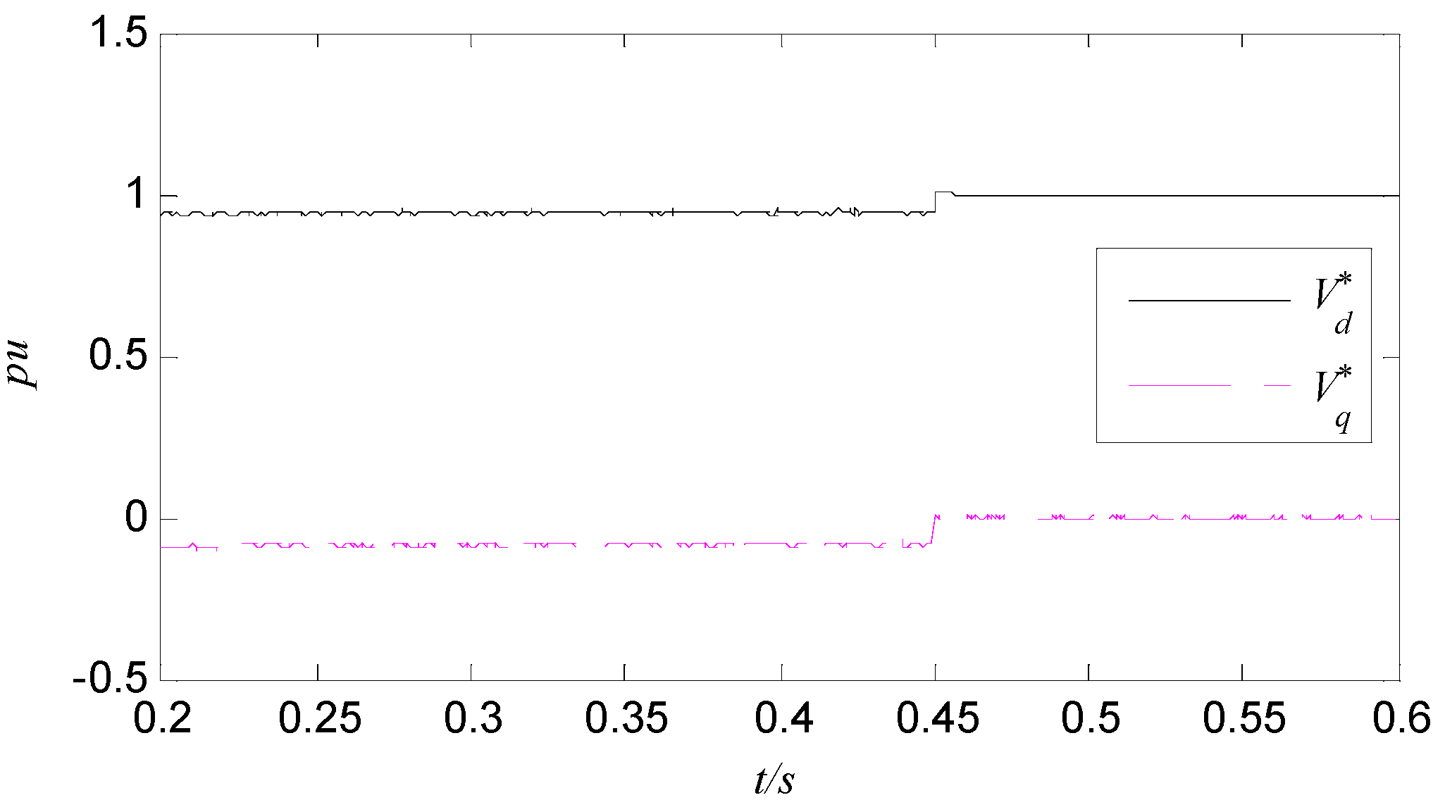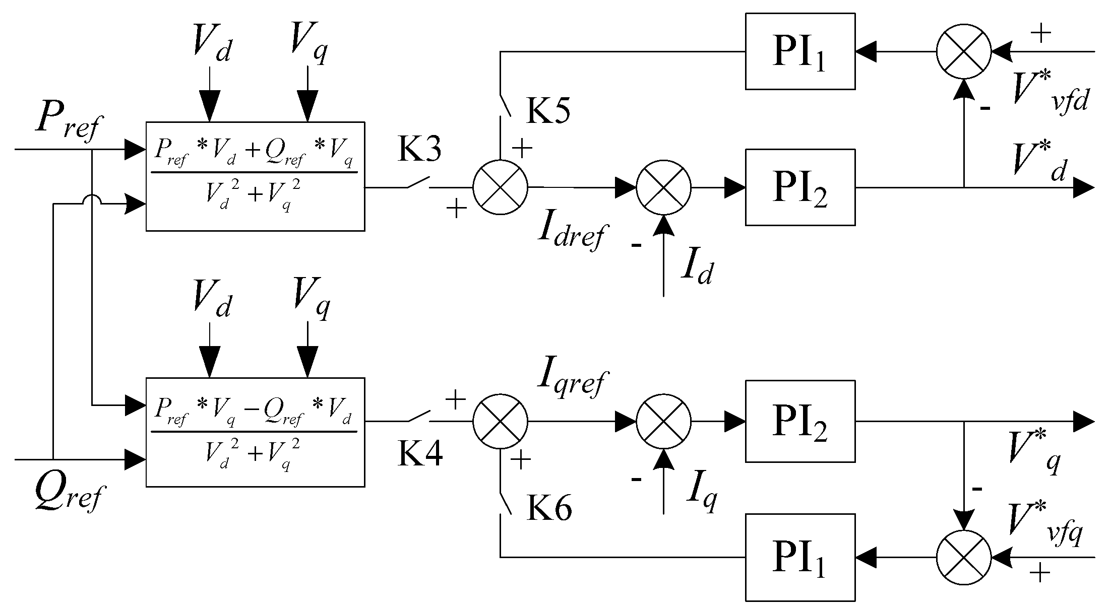- A modified control strategy for seamless mode transfer is designed and implemented, whereby an improved PQ control method is designed by which the output of the PQ controller always synchronously tracks the output of the V/f controller for micro-grid switches from islanded mode to grid-connected, and a dq rotating coordinate synchronization based V/f control method is proposed for transition from grid-connected mode to islanded mode.