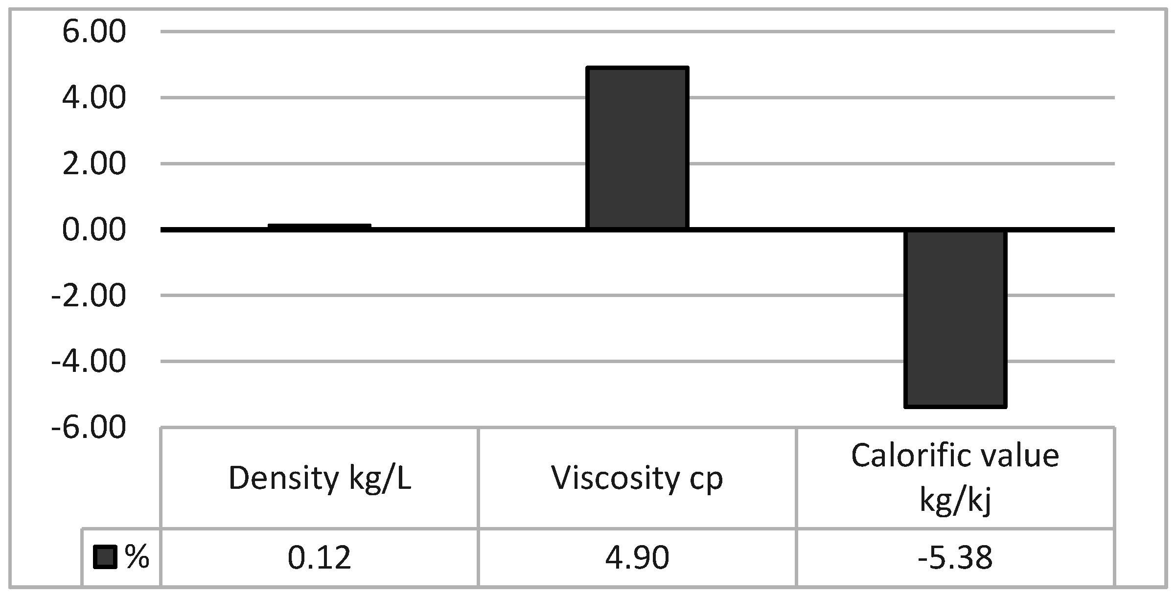 Figure 2. The viscosity of all fuels was measured at 15 °C that resulted in higher values of the viscosity. The viscosity of the MOE20% is 3.5 mm