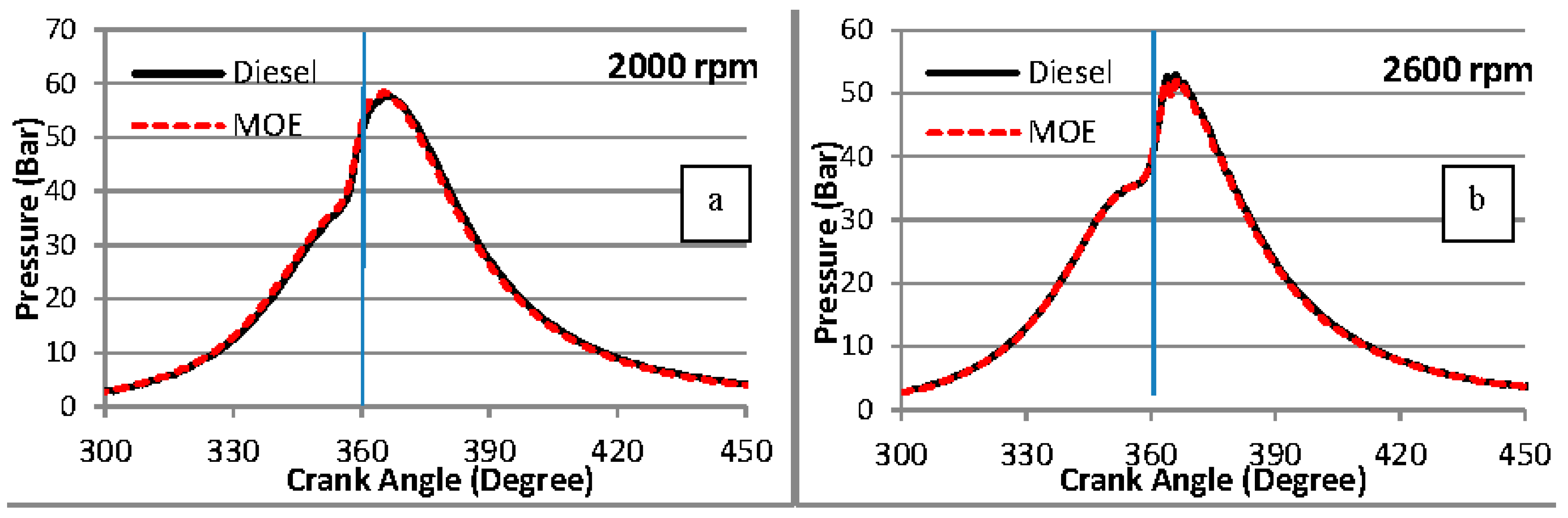 In-cylinder pressure at engine speed (a) 2000 rpm; and (b) 2600 rpm when the engine fuelled with MOE20% and PD.