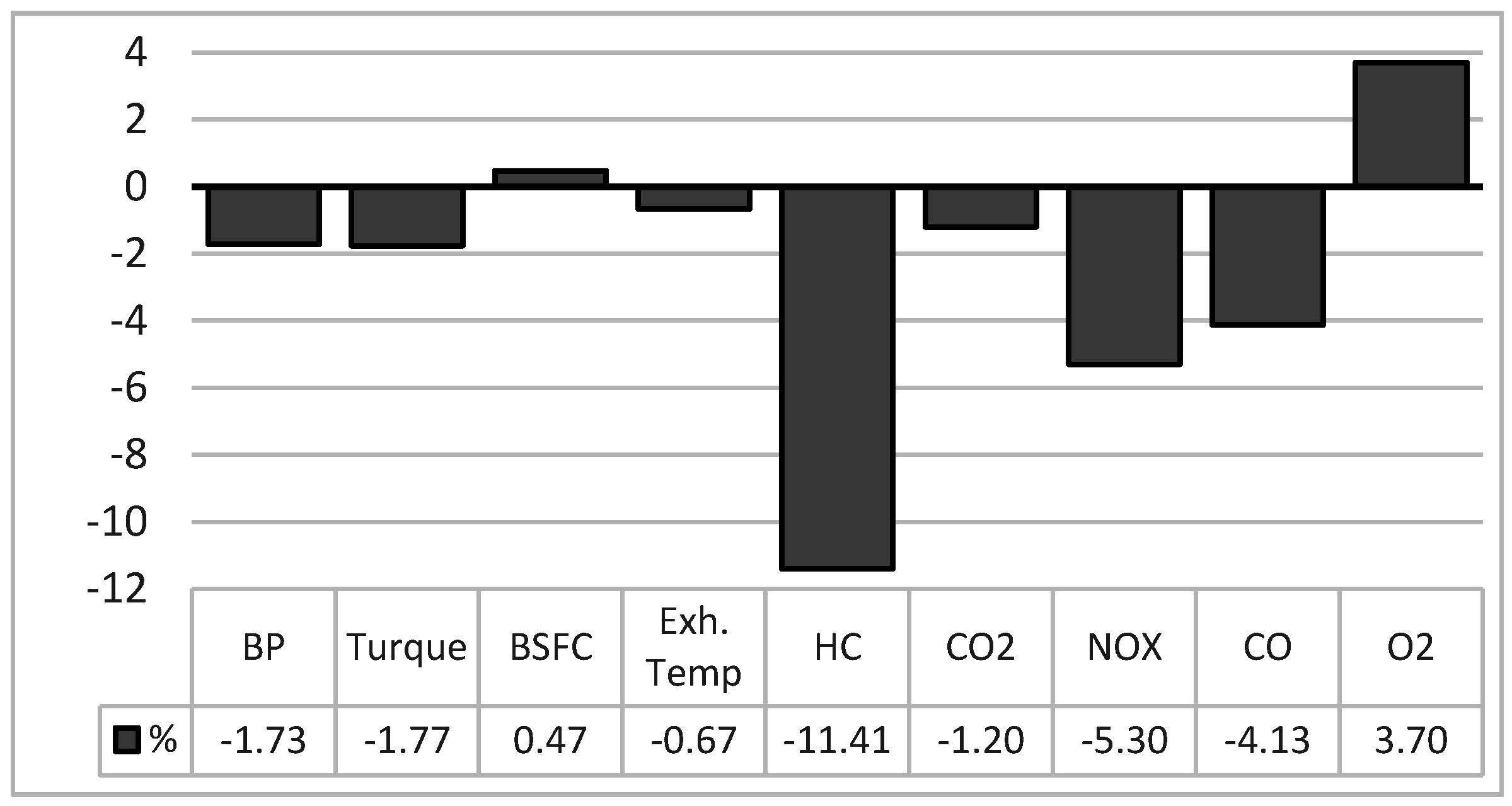 The overall variation in the engine test parameters at average of all tested speed when the engine fuelled with MOE20% compared to PD.
