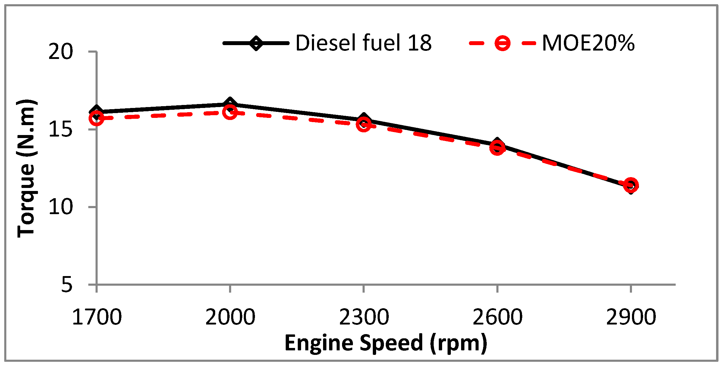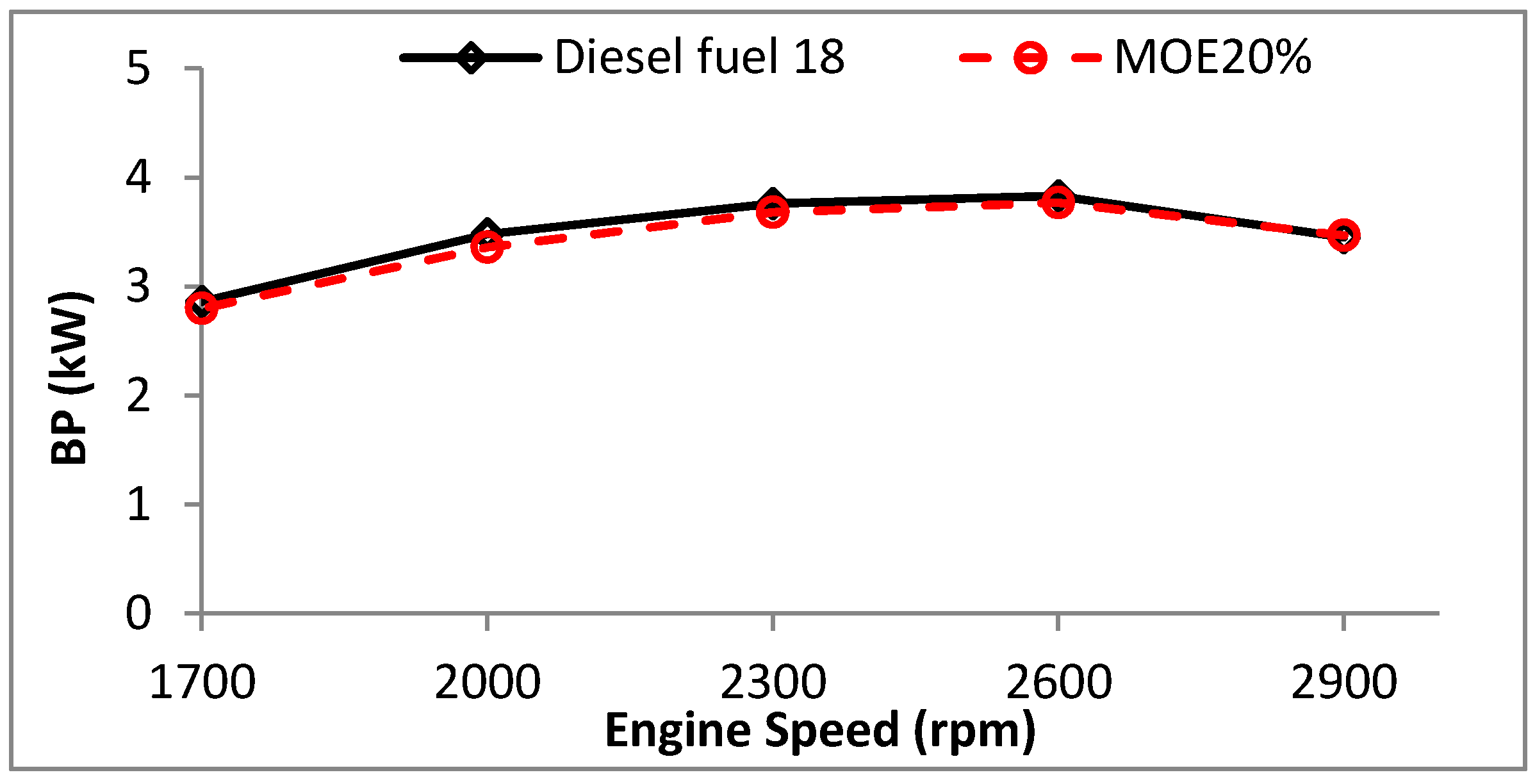Figure 3a,b respectively. These figures revealed almost the same results for PD and MOE20% at all the studied engine speeds. This is in line with the hypothesis that the studied blend properties, which are close to those of PD, result in the same output at the combustion chamber. The fuel properties of density, viscosity and heating value are presented in