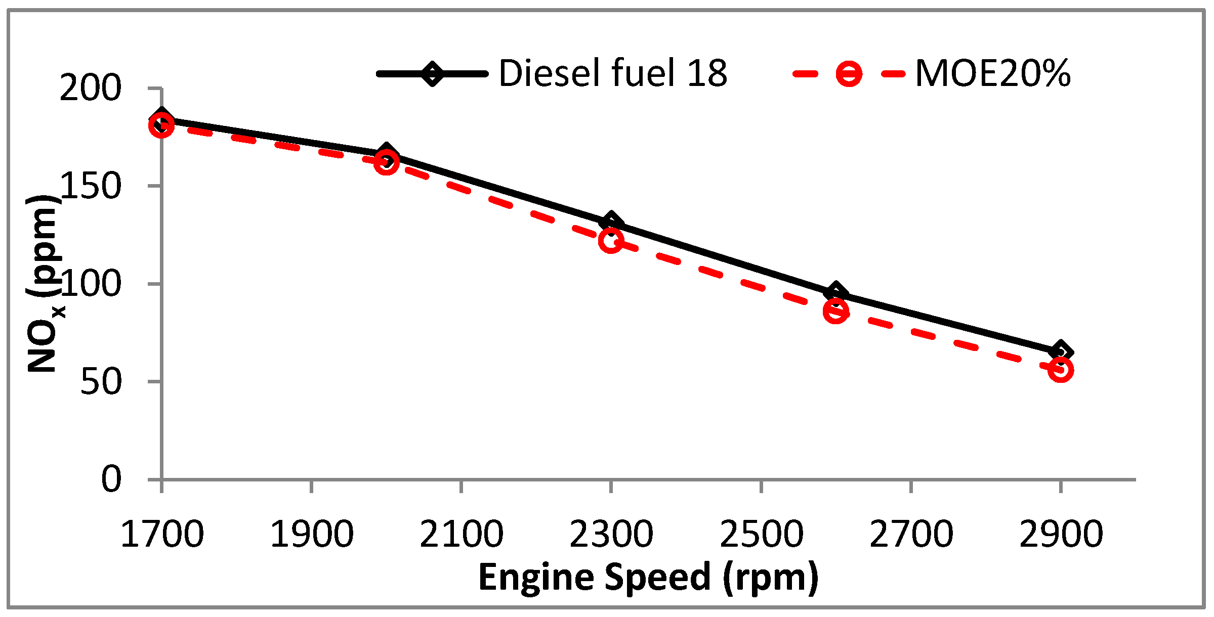x increased as the engine speed increases, with a difference of 6.87% at 2300 rpm, 9.47% at 2600 rpm and 13.85% at the 2900 rpm. The reduction in NO