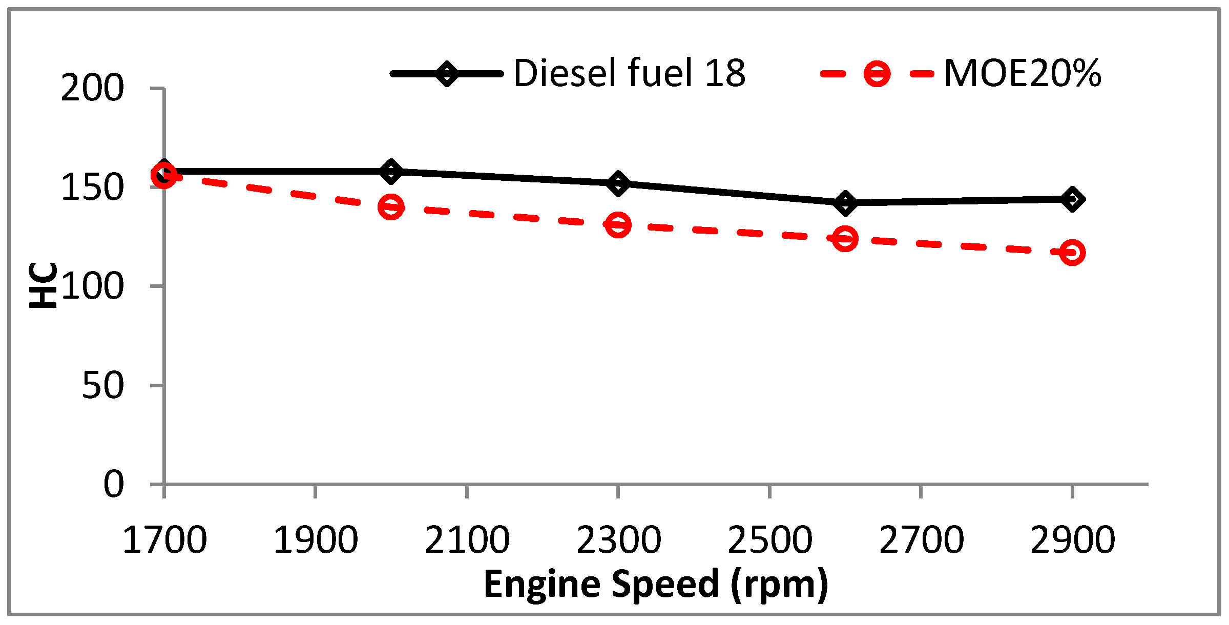 Figure 10. The HC produced from MOE20% is considerably lower than that of PD at most of the tested speeds. The maximum variation between the fuels was observed at the engine speed of 2900 with 18.75% reduction compared to PD. This is due to the better combustion of the microalgae biodiesel and ethanol, the lower carbon content in the MOE20% and the higher H/C ratio. Subbaiah and Gopal [