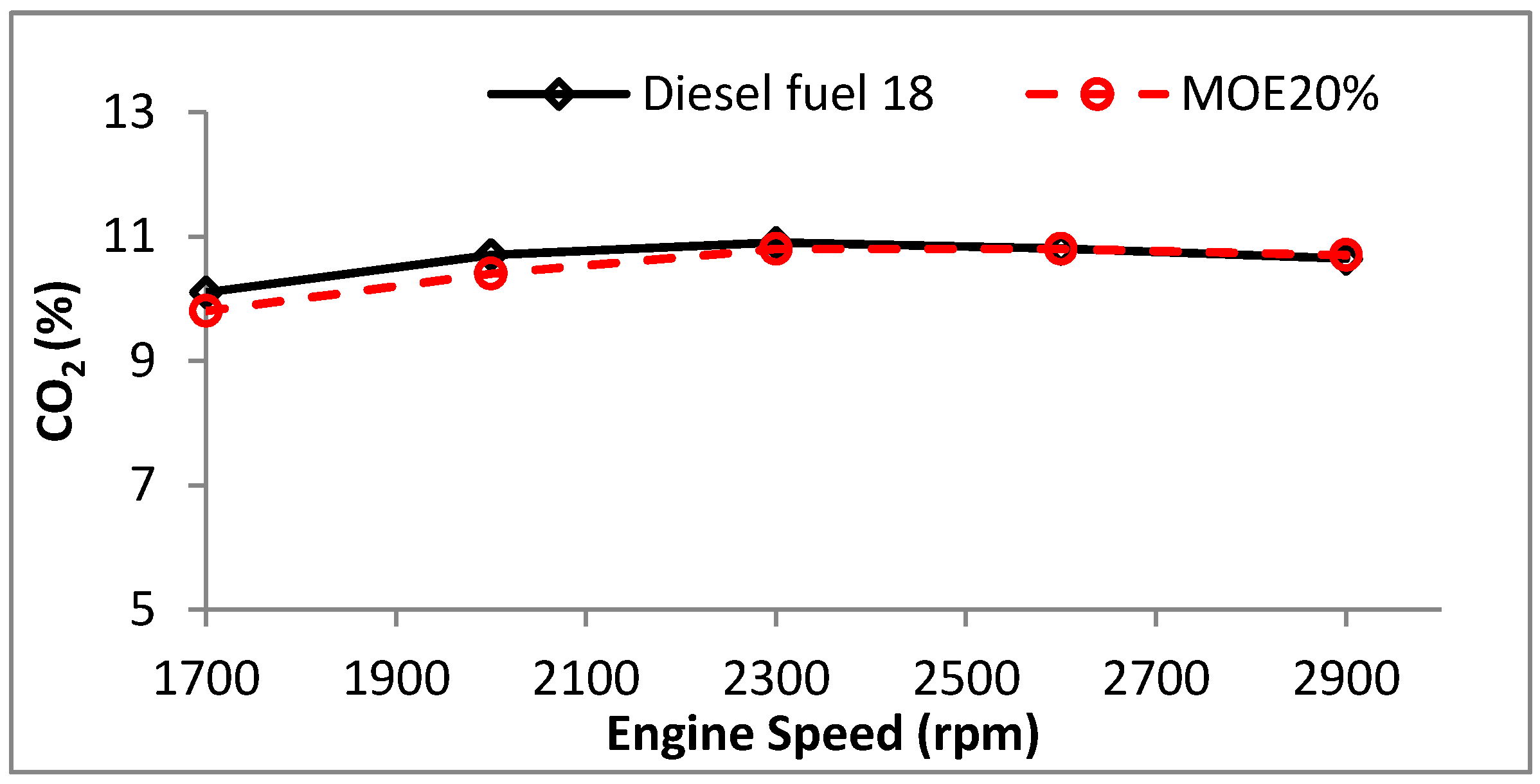 Figure 8. The exhaust gas temperature increased with increasing the speed for both fuels. The variation in the exhaust gas temperature is minor at all engine speeds. The maximum variation is found at low engine speed of 1700 and 2000 rpm of 2.2% and 1.65%, respectively, while at the 2600 rpm, the exhaust gas temperature of MOE20% is slightly higher. This variation is small due to the minor variation in the experimental test conditions and experimental error.