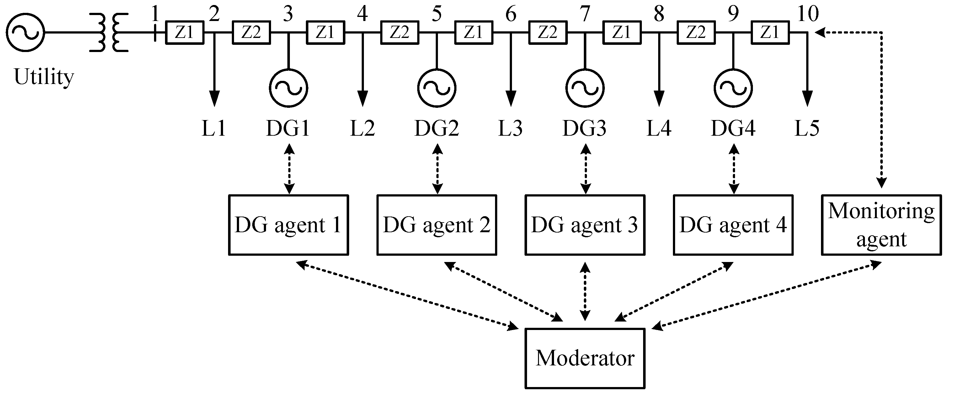 - Awarding: The moderator reviews the proposals and decides how much of the reactive power is to be controlled by each DG for restoring the voltage error. That is to say, the moderator assigns tasks to the DG agents. These tasks are allocated as an increase or decrease in the reactive power at one or more DGs.