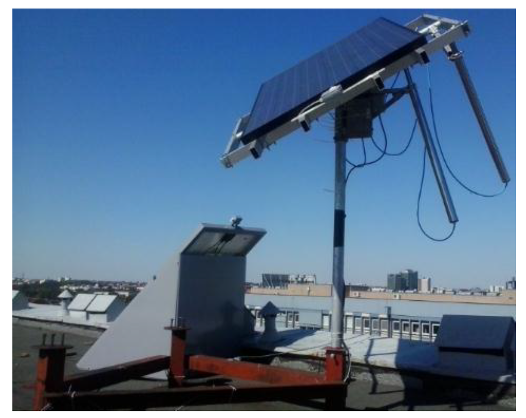 Two-axis tracking system with photovoltaic module, radiation power density meter and microinverter.