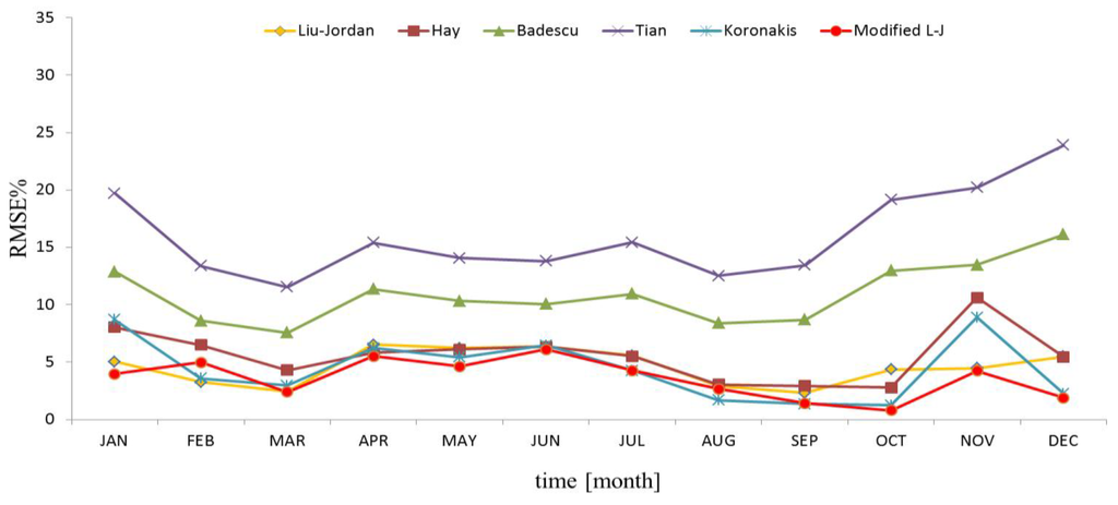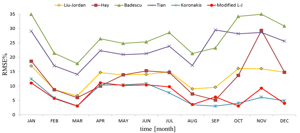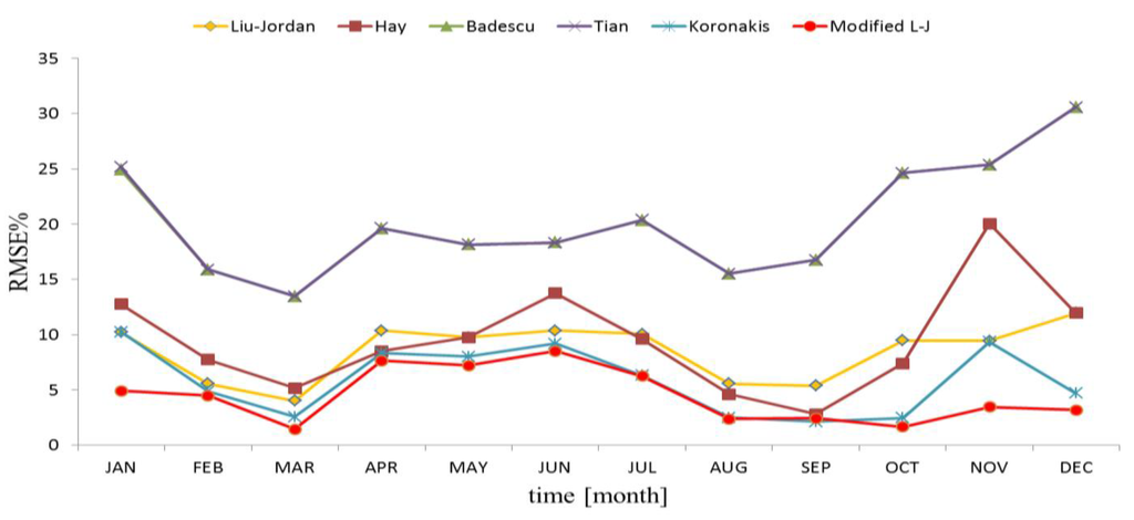 The most common Liu-Jordan isotropic model is characterized by the highest RMSE% during summer months where the anisotropy index reaches higher values. The lowest RMSE% was obtained for February and March, reaching 2.4%. In many cases it is preferred to use anisotropic models for summer months (July, August, September) where circumsolar radiation and radiation coming from brightening of the horizon are significant.