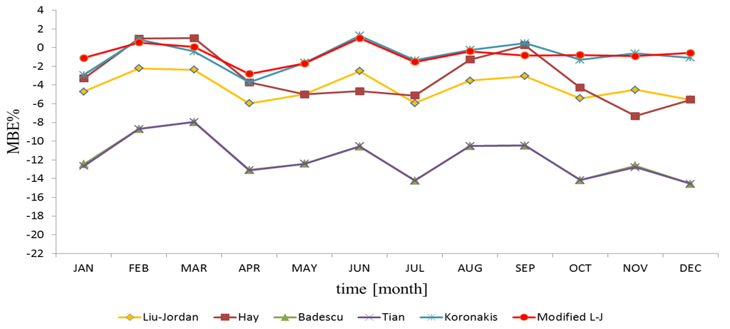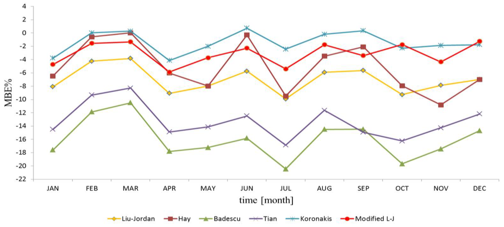 Results of calculations presented in [16] are similar to the values obtained by the authors, where for the inclination angle of 30° the lowest average MBE% is reached by the Koronakis (−0.64%), Hay (−0.95%) and Liu-Jordan models (−1.96%). For higher inclination of 45° and 60°, MBE% increases to respectively −0.89%, −3.25%, −4.25% and −1.43%, −5.18%, −7.05%.