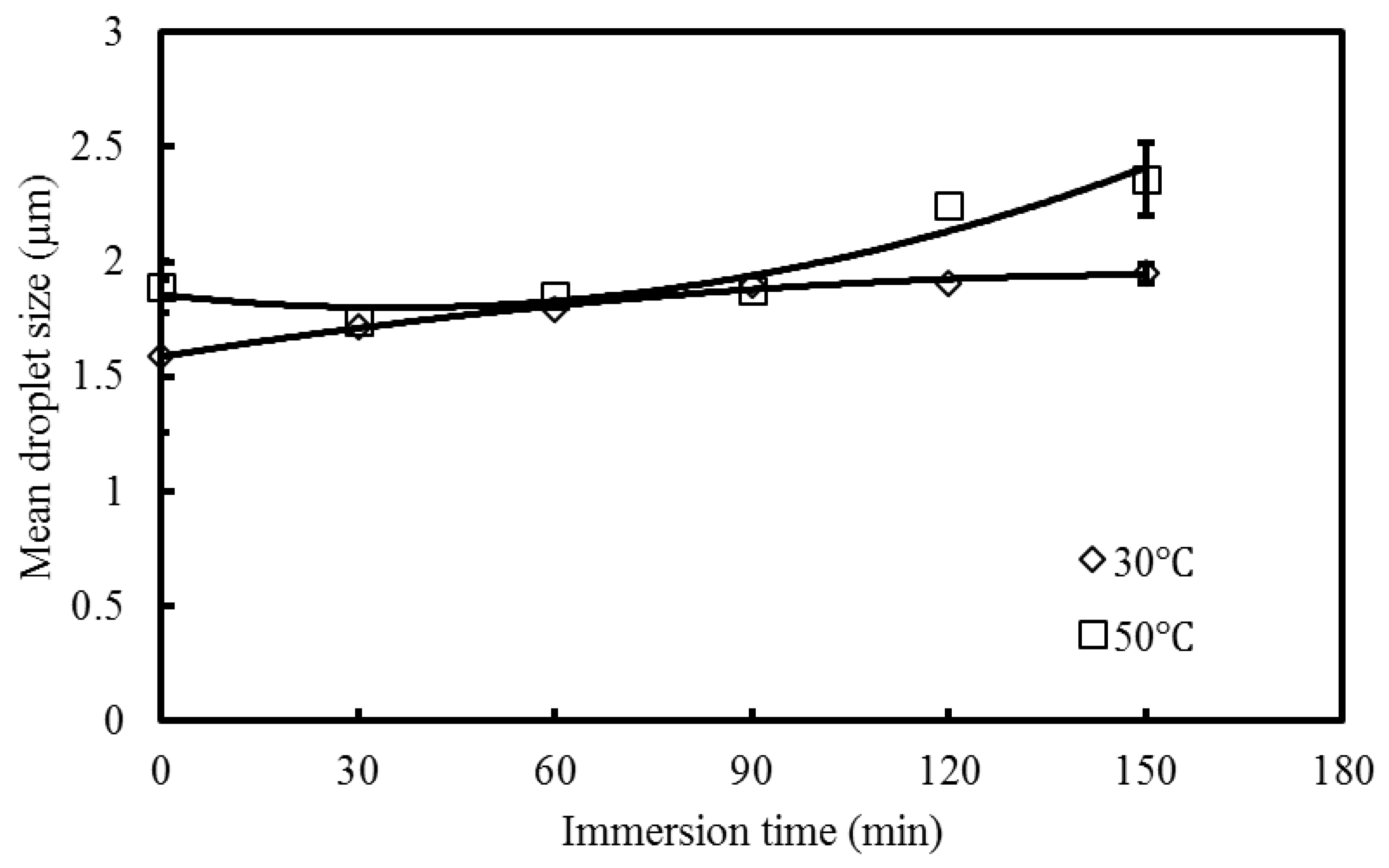 Variations in the mean droplet size in the microalgae biomass at different immersion times in a 0.54 M KCl solution at 30 °C and 50 °C.