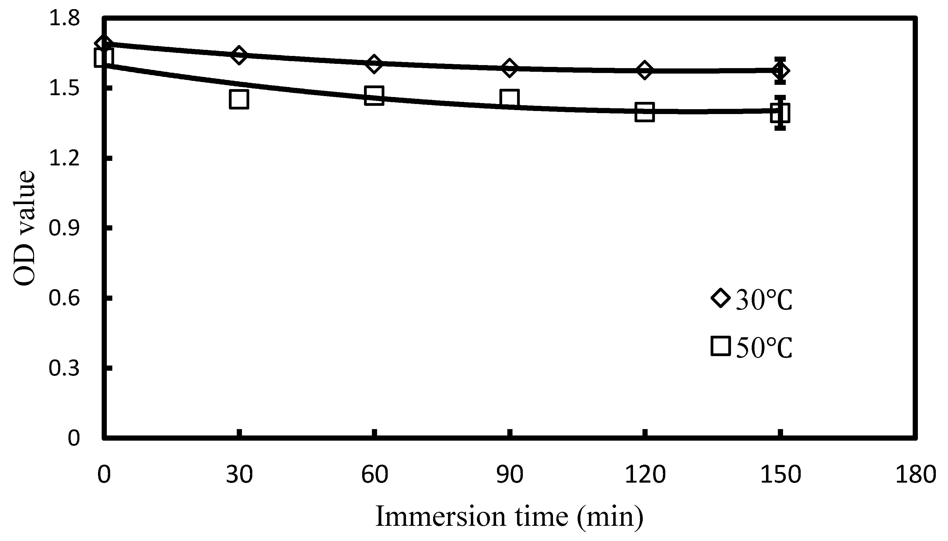Variation was also observed in the microalgae optical density (OD) values of microalgae immersed at different temperatures. The OD value of the microalgae decreased from 1.69 to 1.57 and 1.63 to 1.39 after the solution was immersed at 30 °C and 50 °C, respectively, for 150 min (see Figure 2).
