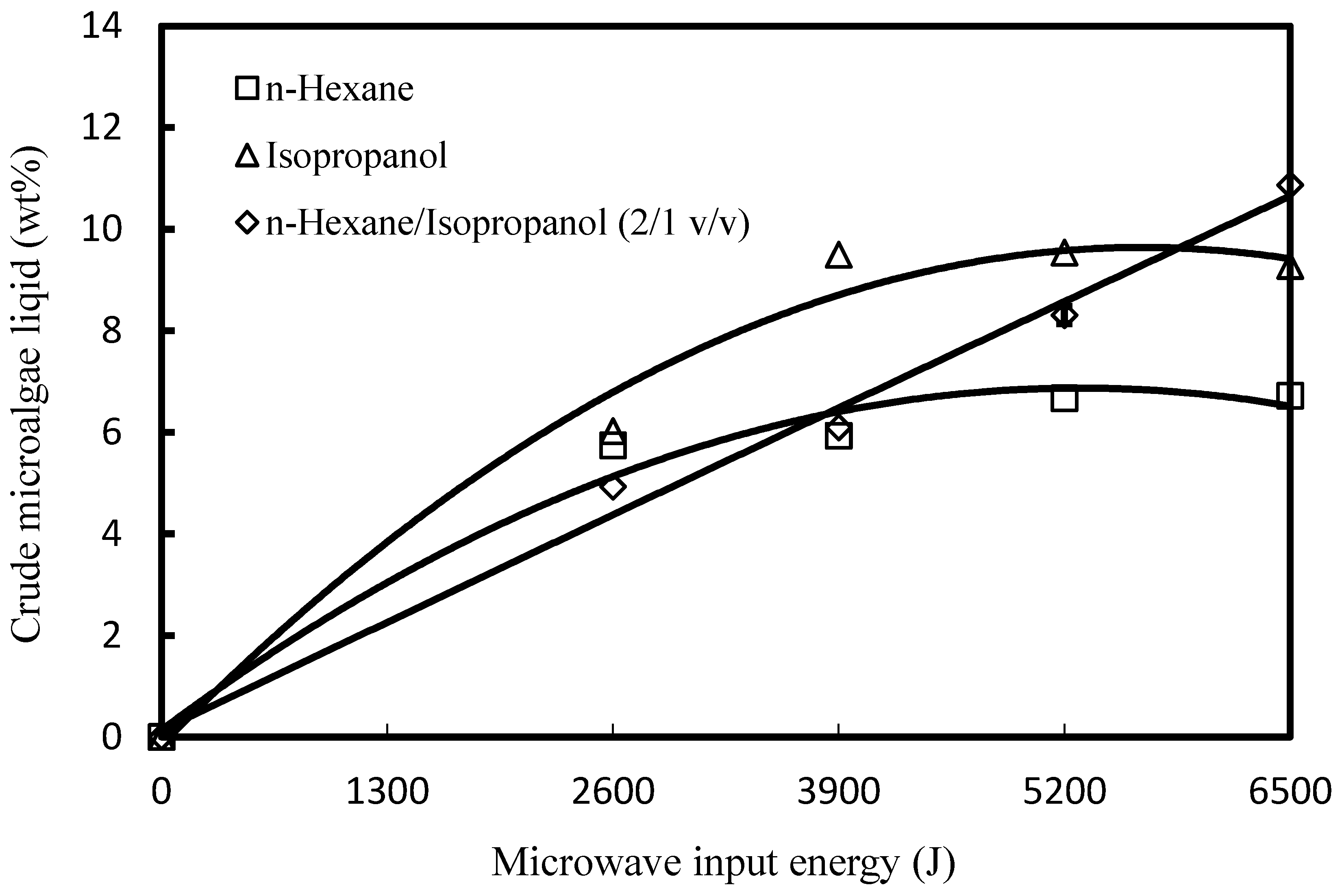 After freeze drying, the lipid of the powder of Isochrysis galbana was extracted using the microwave-assisted method. Three solvents were used for lipid extraction: n-hexane, isopropanol and a direct mixture of n-hexane and isopropanol (2/1 v/v). As shown in Figure 3, the highest amount of crude lipid (10.86 wt%) was extracted from Isochrysis galbana when the solvent mixture of n-hexane/isopropanol (2/1 v/v) was combined with 6500 J of microwave energy.
