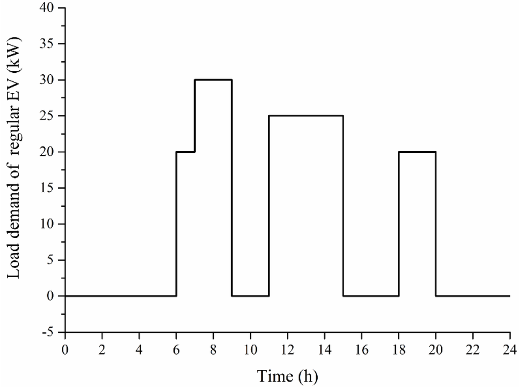 Figure 1 shows the daily load curve of a regular EV, which also reflects the specified outage time and work time of the EV. During the times from 6:00–9:00, 11:00–15:00 and 18:00–20:00, the EV shows load performance and it is unable to charge and discharge. During the times 20:00–6:00, 9:00–11:00 and 15:00–18:00, the EV shows battery performance, PHEVs can exchange power with the grid in two-way mode and BEVs will store abundant electricity. EVs flexibly determine the charging start instant to avoid an overlap with peak load. Unlike BS, regular EVs cannot achieve real-time charging and discharging according to a power difference between power output and load demand. This is because of the constraints of their battery or load performance in the load curve. The power difference is defined as ΔP: