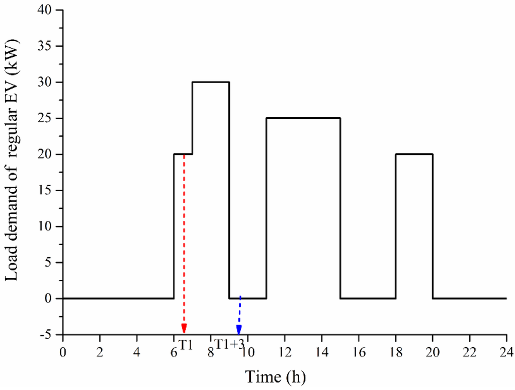 at time T1, this shows the BEV has used up its stored power, and the BEV must be charged at the moment. The charging time of a BEV is 3 h, so the interruption duration of the EV is 3 h and the interruption time adds one. The interruption analysis for BEVs also applies to PHEVs.