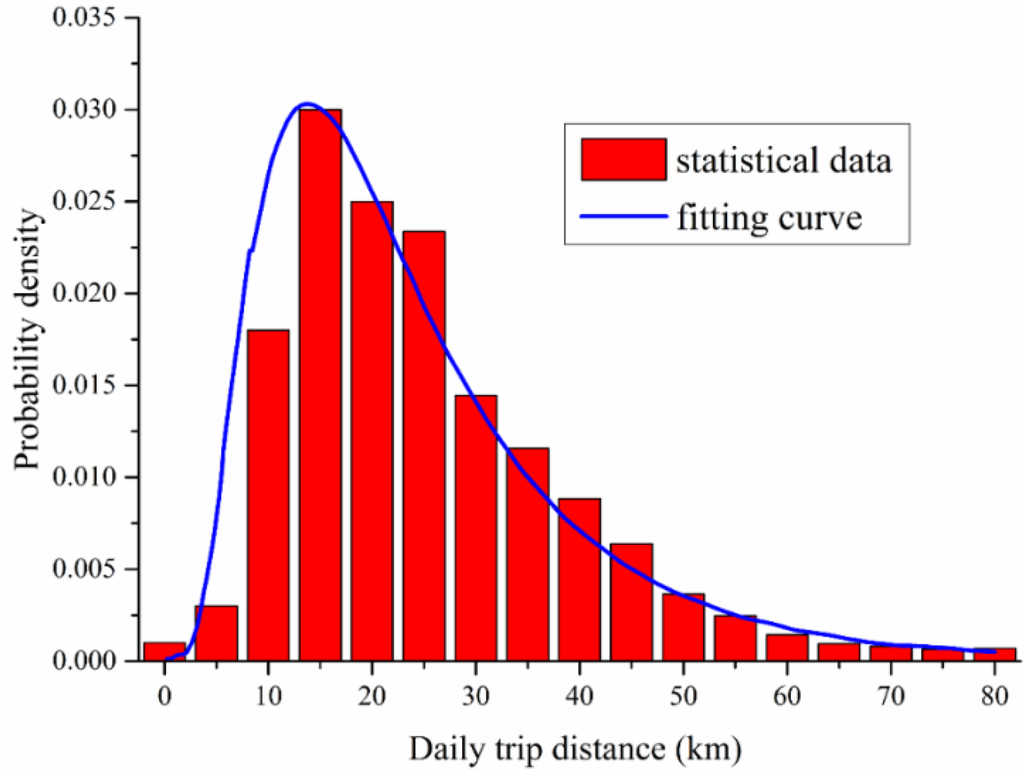 Based on general available information about private vehicle travel in 2013 [], the daily trip distance probability distribution is shown in Figure 3. After normalization processing, the statistical data are fitted to a lognormal distribution, with zero probability of occurrence of all negative distances, and a “tail” extending to infinity for positive distances. The probability distribution function (PDF) for daily trip distance can be expressed as: