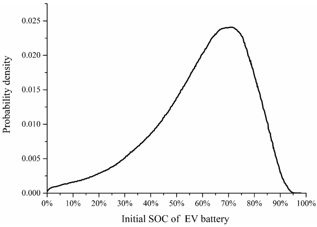 This paper uses some hypotheses: (1) the specific power consumption is constant; (2) each EV is independent; (3) the same type of batteries have the same charging characteristics; (4) the initial SOC on the first day is 100%; (5) the daily trip distance and traveling start time are independent; and (6) the initial SOC and charging start instant are independent.