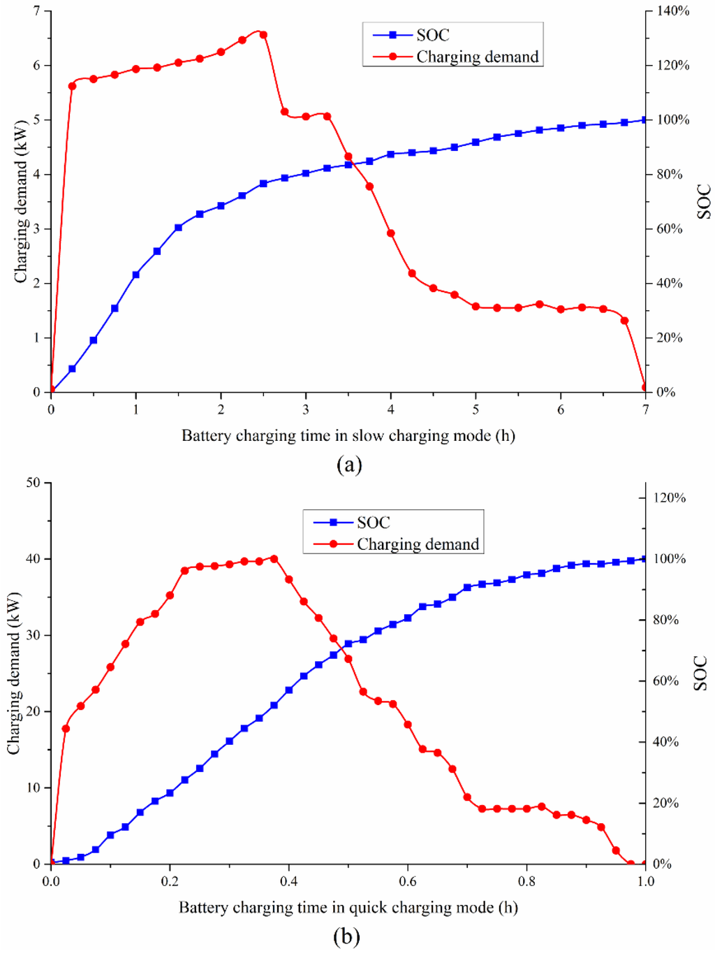Lead-acid, lithium and NI-MH batteries are widely used in EVs. Due to their higher self-discharge rates and shorter service life, NI-MH batteries are mainly used for hybrid electric vehicles. With reliable performance, low cost and mature technology, lead-acid batteries still dominate in market share. Because of their small size, high power density, high voltage, low self-discharge and low resistance, lithium batteries are the developing trend for future EVs. The GM EV1 is introduced to analyze the charging demand and discharging capacity of EVs in this paper. The GM EV1 has a 27.19 kWh capacity lead-acid battery. The charging demand and related battery SOC profiles of a lead-acid battery in slow and quick charging mode are shown in Figure 5a [] and Figure 5b [].