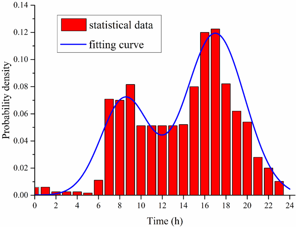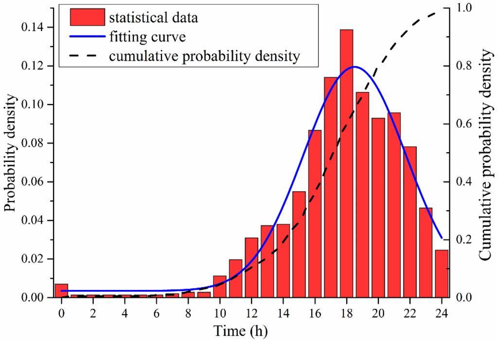 Slow charging uses a lower power charging facility to complete charging; this is suitable for parking lots in the community. Due to the longer charging time, drivers usually recharge EVs when they arrive home after their last trip of the day, so the charging start instant approximately equals the end time of the last trip. According to statistical data [], a probability distribution of end time of last trip is developed in this paper, as shown in Figure 6.