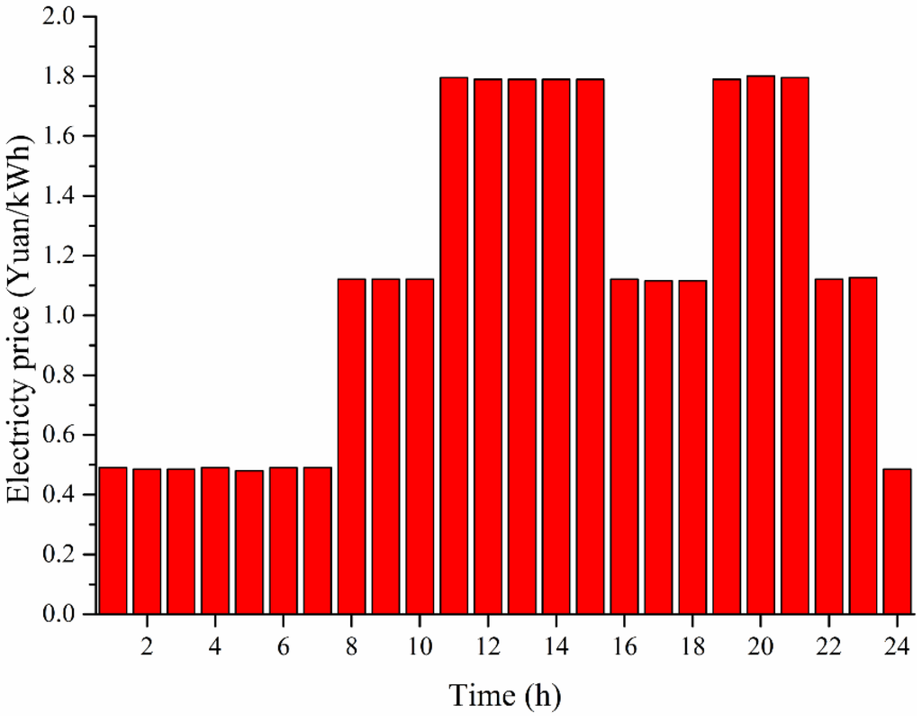 According to the time-of-use power price in Figure 8 [] and daily load curve, a BSS provides a reasonable charge and discharge plan. The BSS recharges the replaced empty batteries in slow charging mode at low cost and low load, which can reduce the power purchase cost and avoid “peak load superposition”. BSS makes positive contributions to peak load shifting and reduce the valley-to-peak and variance of daily load curves. According to objective functions and constraint conditions, a BSS determines the charging start instant and discharging instant. The objective functions and constraint conditions are expressed as: