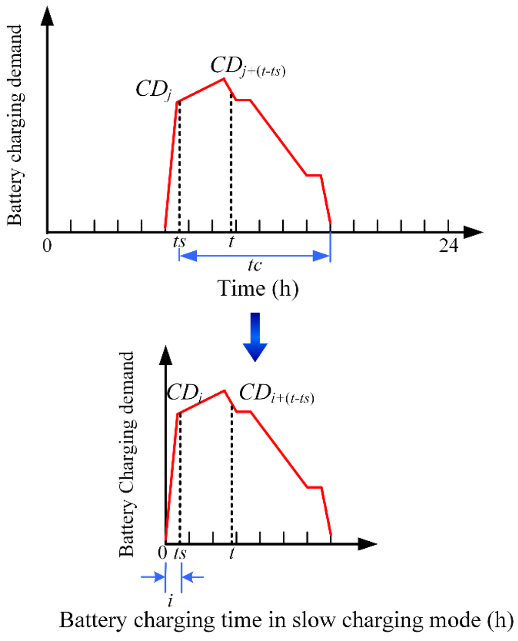 According to Equation (18) denoting the mapping relationship between charging demand and charging time, the charging time related to the CDts is Ti, and the charging time related to CDt is Ti + (t ‒ ts), so the term CDt can also be expressed as CDTi + (t ‒ ts). The charging load of a single EV at time t can be expressed as: