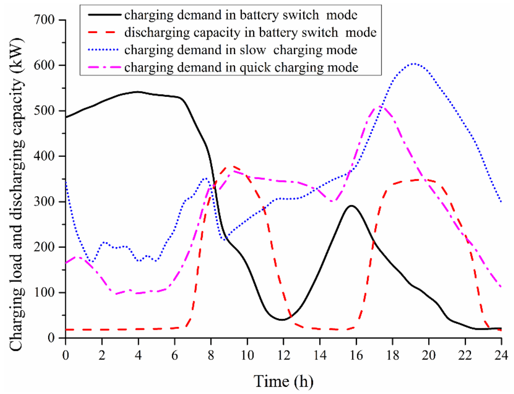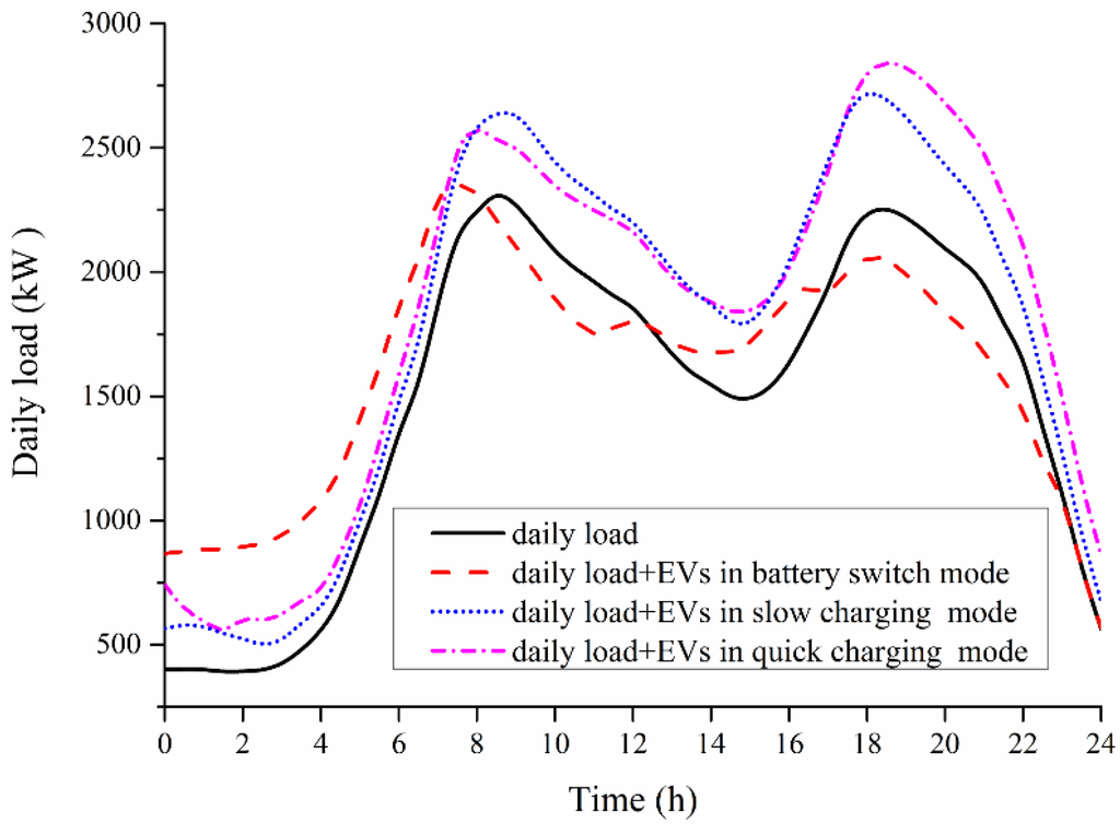 Based on the probabilistic model and charge and discharge optimization model under discussion, the Monte Carlo method is introduced to simulate the charging load and discharging capacity of ruleless EVs, The covariance coefficient of charging load and discharging capacity is defined as the convergence condition. The resultant curves of charging load and discharging capacity in three recharging modes are shown in Figure 10. In addition, Figure 11 intuitively reflects the influence on daily load curve caused by EVs in these three recharging modes.