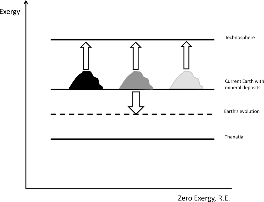 Henceforth, one must distinguish between the concepts of “exergy” and “exergy resource”. Exergy is conventionally calculated from a thermodynamic R.E. In contrast, an exergy resource is calculated from Thanatia as a baseline. Thanatia involves the choosing of a reference bare rock from which a material could be extracted as an alternative to their current mineral deposit. This conceptual complexity can be solved through a minor calculation, since exergy is an additive property. Thus, an exergy resource is obtained as the exergy of the material minus that of the corresponding bare rock constituting Thanatia. Figure 1 shows a graphical representation of the exergy of Thanatia and the current state of the Earth with respect to the reference environment. When minerals are extracted and refined, one is in fact increasing the exergy of the produced raw materials used in the technosphere. This is, however, done at the expense of depleting the mineral deposits from which they stem and the consumption of additional resources (such as fossil fuels) for mining and metallurgical processes. As a consequence, the Earth gradually loses exergy and approximates Thanatia [8].