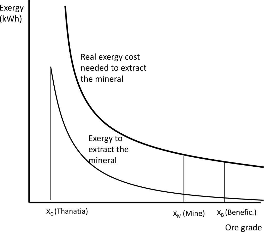 This is, in short, a “grave to cradle approach”, since it is concerned with the amount of actual exergy needed to re-produce a mineral from the depleted state of Thanatia to the conditions of the mine where it was originally found. The exergy difference between Thanatia and the mine increases with the mine’s quality (i.e., with its ore grade). This means that as mineral deposits become exhausted, the exergy difference between Thanatia and the mine reduces. At the threshold where all natural resources have been extracted and dispersed, this difference is equal to zero; that is to say, the planet has lost all of its “natural bonus”. Since the grave-to-cradle process is hypothetical, the exergy replacement cost is not truly an embodied exergy. Rather, it can be considered a hidden or avoided cost, and hence, both terms cannot be used as synonyms, as is the case for cradle-to-grave analyses [26].