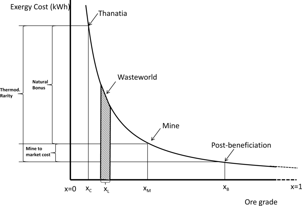 One now may define rarefaction as an induced decline of the concentration of a given commodity, making thus its recovery costly. In the technosphere, rarefaction appears both at the mineral’s beginning-of-life (BoL) and at its end-of-life (EoL). At the EoL, it occurs when a metal or mineral loses its usefulness and becomes landfilled, incinerated and, sooner or later, dispersed in Thanatia, i.e., it “rarefies”. Its irreversible loss is accounted for by its exergy replacement cost from the concentration of the element in the wasted product to the concentration in landfill, xL, or if dispersed in Thanatia, xc (see Figures 4 and 5). When this occurs, Man is irreversible converting highly concentrated substances into waste. The name “wasteworld” is used here to express all accumulated worldwide landfills showing a concentration range of around xL. At the BoL, when the mineral is mined and beneficiated, what remains in the mine also rarifies, given that the concentration decreases, gradually approaching the limit of Thanatia. This process is is the well known “mining ore grade decline”. As a consequence and as stated previously, the amount of exergy needed to extract the next ton of mineral in turn increases. The rarefaction process therefore appears twice, one at the BoL and the other at the EoL. In the authors’ opinion, society should be aware of both processes in quantitative terms (kWh).