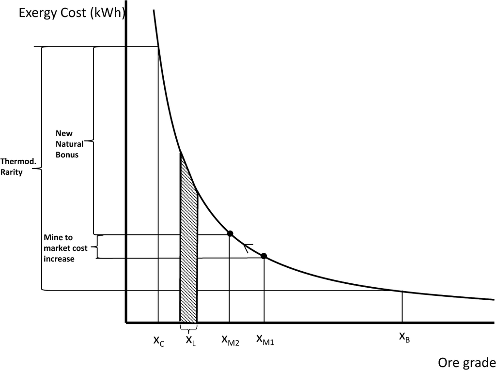Bearing in mind the above limitations and the energy data available for mining processes (which is usually very scarce), the authors assume that the same technology is applied for the entire range of concentration between the ore grade xm in the mine and the pre-smelting grade, xr, than between the dispersed state found in Thanatia, xc and xm.