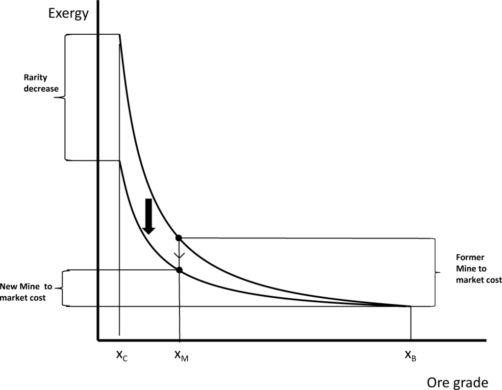 The idea of replacement cost allows one to move into another concept: “thermodynamic rarity”. The Webster Dictionary defines rarity as “something that is valuable because there are few of its kind”. Rarity therefore relates to the difficulty in attaining something. In the case of a mineral deposit, it is associated with the improbability of finding and accessing. Once accessed, it also relates to the effort of isolating it from undesired impurities, considering environmental conditions and the availability of water, energy and resources in general for its supply to market. Rarity thus prescribes the character of a natural resource to a given mineral deposit. If one considers all of these characteristics from a thermodynamic perspective, they are all rooted in entropy.