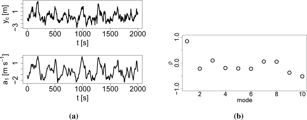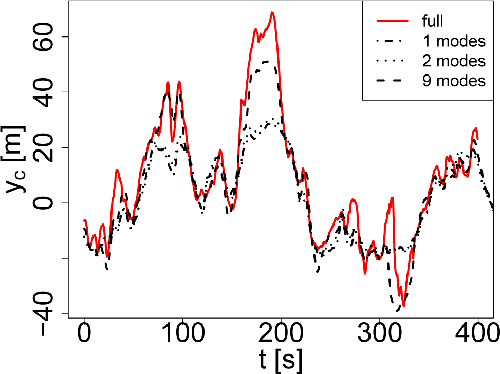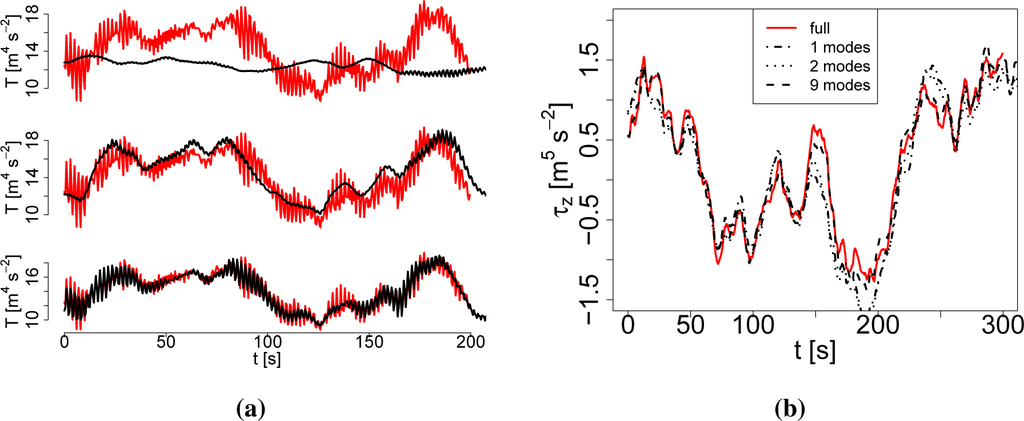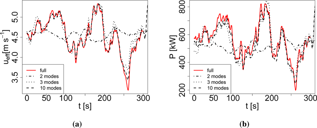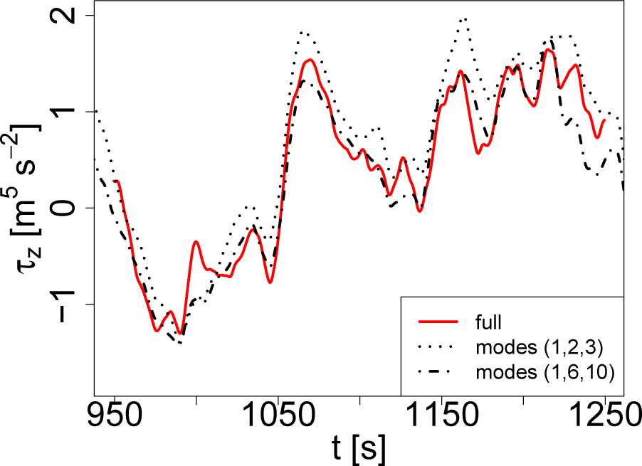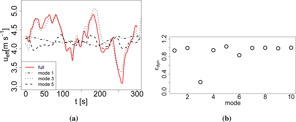 The similar performance of ueff, P and T, particularly the sudden jump with the third mode, is probably caused by the fact that all three measures are integrated over the whole rotor or blade area without any specific weighting. It seems to be of minor importance whether we integrate over u, u2 or u3. The slightly weaker performance of T, especially with more modes, probably results from the integration over the smaller blade area. Therefore, smaller structures are important for the dynamics of T, which cannot be resolved by only a few modes. This can also be seen in the time series in Figure 8a, where three modes nicely recover the macroscopic behavior of T, but 10 modes still fail to grasp some of the finer structures of the signal. The distinct behavior of εdyn for τz is likely to be caused by the weighting with the signed distance to the rotational axis. Due to this weighting, modes symmetric to the rotational axis become less relevant than antisymmetric modes.
