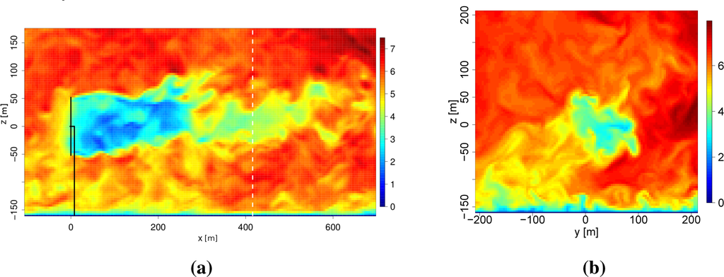 The generated data are written out at a rate of 2 Hz with a time series length of 11,750 s after excluding the first 500 s of the simulation. For our analysis, we focus on data in a yz-plane perpendicular to the main flow, which is placed 4D downstream of the turbine (the white dashed line in Figure 2a). At this distance, we expect only minor differences between the standard actuator disk model used here and more sophisticated actuator models [11,45]. Furthermore, we confine our analysis to the main velocity component yielding a spatio-temporal data field u(y, z, t). A snapshot of this data field for t = 500 s can be seen in Figure 2b. It shows a pronounced wake downstream of the turbine with a strong reduction of the flow velocity.