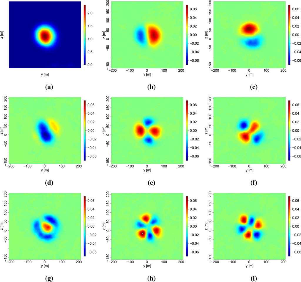 The modes resemble Fourier modes in the azimuthal direction. We find roughly rotationally symmetric Modes 3 and 6 and pairs showing a dipole-like structure (1, 2), quadrupole structure (4, 5) and hexapole structure (7, 8). These observations indicate an approximate statistical isotropy [25]. This is a remarkable result, since the rotational symmetry is clearly broken by the ABL. The extracted wake structure therefore behaves approximately isotropic in the non-isotropic ABL flow. Obviously, the rotational symmetry is not perfect. Mode 3, for example, also indicates the presence of principal axes that do not coincide with the horizontal and vertical direction. Furthermore, the eigenmode pairs described above do not correspond to the same eigenvalue (see Figure 4a).