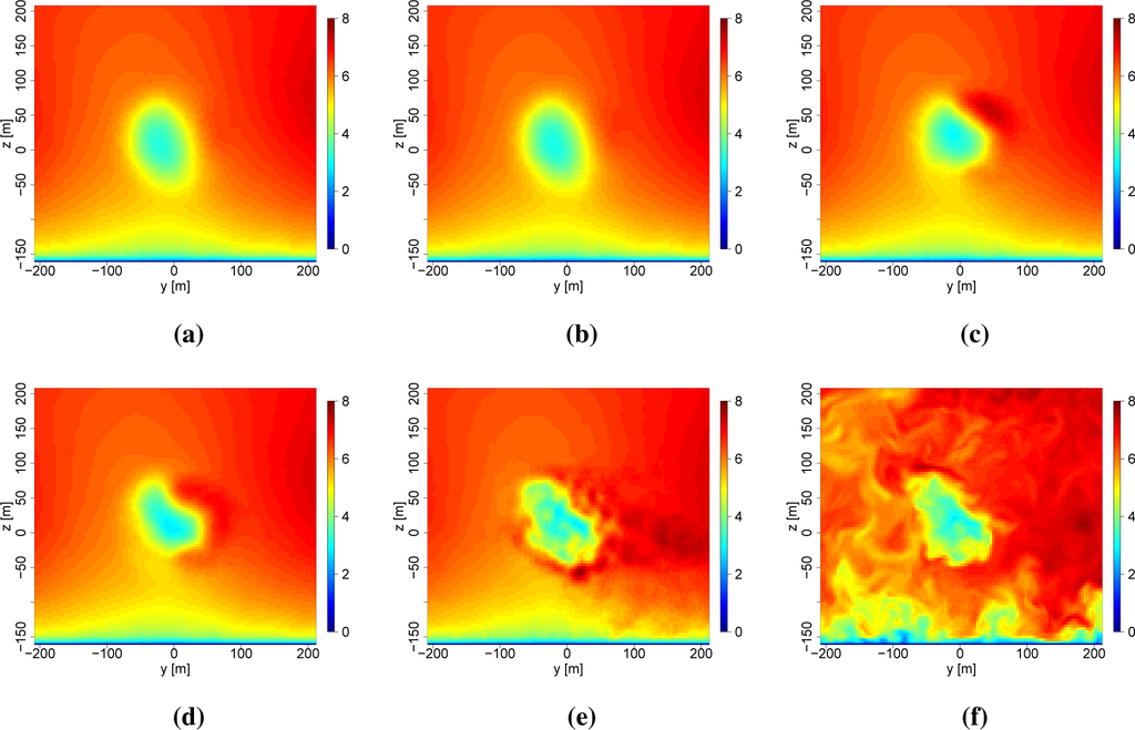 We now use the extracted POD modes to approximate the original field u(y, z, t) according to Equation (9) and vary the number of modes N used for the reconstruction. Examining the reconstructed snapshots (Figure 5), we see that more modes obviously lead to a more accurate description of the wake structure. To recover the spatial small-scale structures of the wake, many POD modes are necessary. Unfortunately, this pure visualization does not offer many clues for the number of modes necessary to obtain a useful low order description. The slow increase of the recovered turbulent kinetic energy with N, discussed in the former section, indicates that useful reduced order models need to contain a lot of modes. However, in the context of wake modeling, we are also interested in other quantities describing the impact of the turbine on the wake. Therefore, we propose the use of other quantitative measures of quality in the next section.