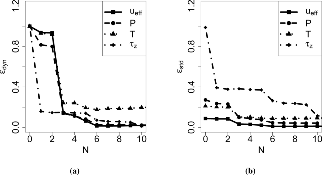 The standard error shows the same discontinuous behavior as the dynamical one with jumps at identical numbers of modes as identified for εdyn (Figure 9b). However, two major differences can be found. The first difference is that for ueff, P and T, the standard error is already very low when only using the mean field of the flow, with around 10% for ueff and 20% for P. The second is the generally weaker performance of τz. This different behavior stems from the fact that εdyn neglects the mean values of the measures in contrast to εstd (compare Equations (12) and (13)). For ueff, P and T the steady mean field without any modes already yields a good description of the mean values of ueff, P and T. Since the mean values of these measures are larger than the fluctuating parts, this yields the small standard error in Figure 9b. Further details, also on the behavior of τz, can be found in Appendix C.